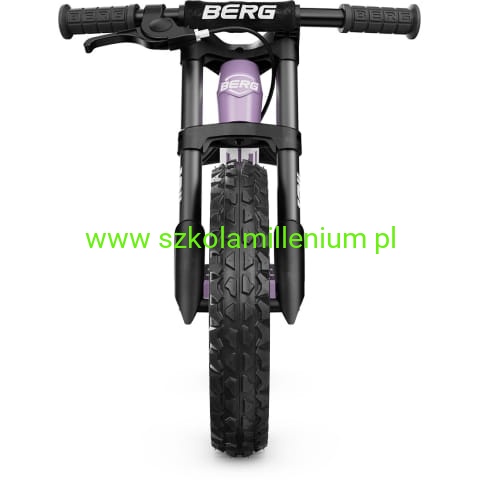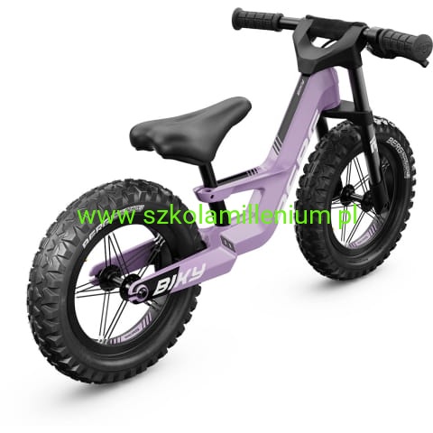 Aluminiowe felgi i wytrzymała rama w kolorze fioletowym, kontrastująca z metalizowanym widelcem przedniego koła oraz nakrętkami rowerka. Rowerek biegowy Biky Cross z hamulcem ręcznym ma wszelkie cechy, jakich można się spodziewać po jego rajdowym wyglądzie, czyli 12 calowe koła o aluminiowych felgach i super lekka rama aluminiowo-magnezową. Koła Biky Cross wyposażone są w czarne opony terenowe o głębokim bieżniku, regulowany fotelik oraz ochronną owijkę kierownicy. Biky Cross Purple waży zaledwie 3,99 kg i wyposażony jest w dwustopniowy regulator kąta skrętu koła przedniego, fotelik z regulowaną wysokością i sportowo wyglądający widelec przedni.