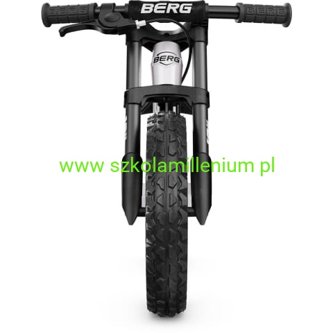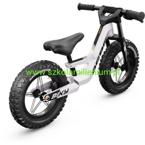 Aluminiowe felgi i wytrzymała rama w kolorze białym, kontrastująca z metalizowanym widelcem przedniego koła oraz nakrętkami rowerka. Rowerek biegowy Biky Cross z hamulcem ręcznym ma wszelkie cechy, jakich można się spodziewać po jego rajdowym wyglądzie, czyli 12 calowe koła o aluminiowych felgach i super lekka rama aluminiowo-magnezową. Koła Biky Cross wyposażone są w czarne opony terenowe o głębokim bieżniku, regulowany fotelik oraz ochronną owijkę kierownicy. Biky Cross White waży zaledwie 3,99 kg i wyposażony jest w dwustopniowy regulator kąta skrętu koła przedniego, fotelik z regulowaną wysokością i sportowo wyglądający widelec przedni.