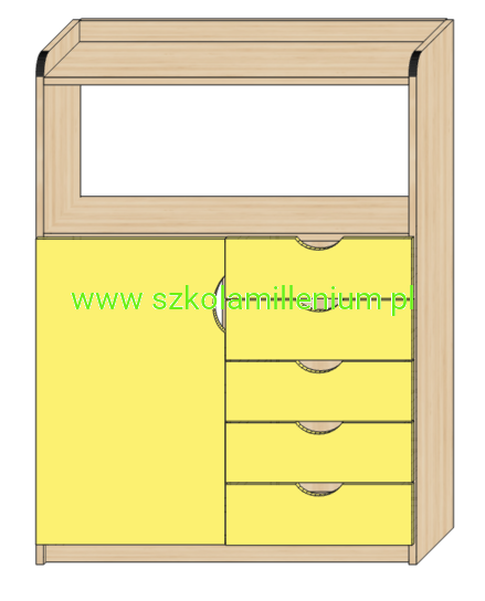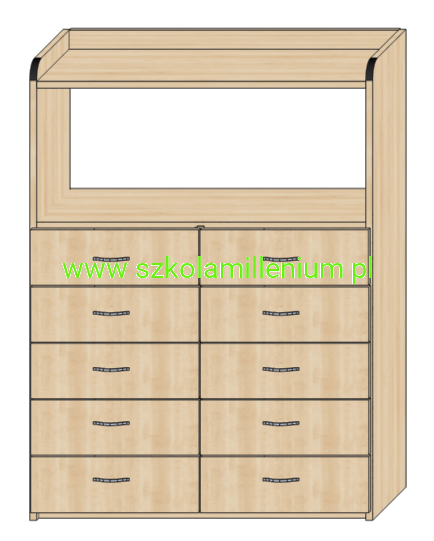 Szafka w dolnej części posiada front zamykany z dwoma półkami w środku oraz pięć szuflad na prowadnicach kulowych, powyżej półka otwarta.