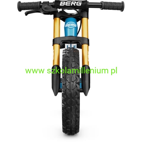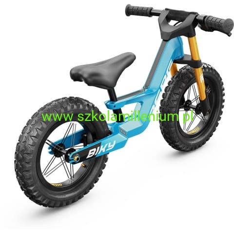 Aluminiowe felgi i wytrzymała rama w kolorze błękitu, kontrastująca z metalizowanym widelcem przedniego koła oraz nakrętkami rowerka. Rowerek biegowy Biky Cross z hamulcem ręcznym ma wszelkie cechy, jakich można się spodziewać po jego rajdowym wyglądzie, czyli 12 calowe koła o aluminiowych felgach i super lekka rama aluminiowo-magnezową. Koła Biky Cross wyposażone są w czarne opony terenowe o głębokim bieżniku, regulowany fotelik oraz ochronną owijkę kierownicy. Biky Cross Blue waży zaledwie 3,99 kg i wyposażony jest w dwustopniowy regulator kąta skrętu koła przedniego, fotelik z regulowaną wysokością i sportowo wyglądający widelec przedni.