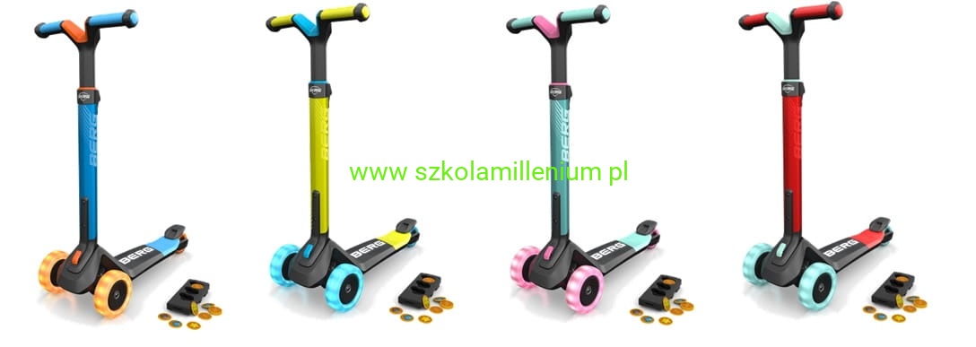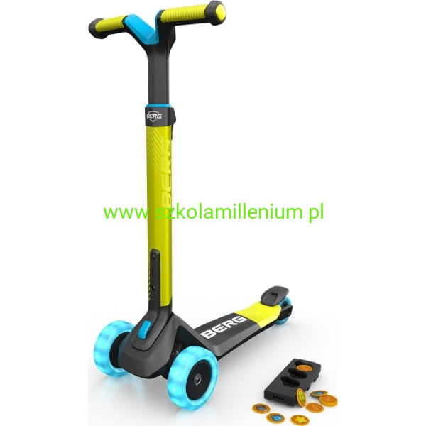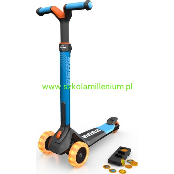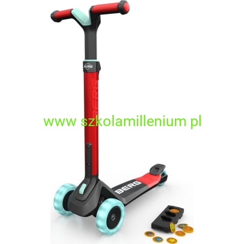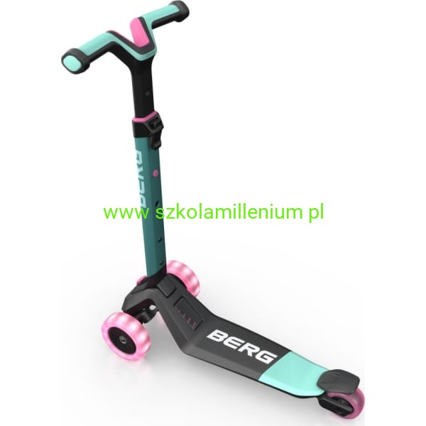 Hulajnoga BERG Nexo Lights Magnet wykonana z wysokiej jakości aluminium, tworzywa sztucznego i stali. Pojazd posiada antypoślizgowy materiał na podnóżku i uchwytach, co zapewnia stabilność i bezpieczeństwo podczas jazdy. Ergonomiczny, odporny na zużycie hamulec nożny oraz trzykołowa konstrukcja to dodatkowy atut. Wyposażona w blokadę i regulowaną trzystopniową kierownicę, która "rośnie" razem z dzieckiem, zapewniając optymalne dopasowanie i komfort jazdy przez wiele lat. Składana jednym kliknięciem, co ułatwia jej przechowywanie i transport. Dzięki specjalnemu uchwytowi można ją również wygodnie ciągnąć za sobą. Hulajnoga posiada szerokie, odporne na ścieranie i duże koła PU, które zapewniają płynną jazdę na różnych powierzchniach. Solidne wykonanie kół gwarantuje długą żywotność i niezawodność podczas codziennego użytkowania. Dodatkowo hulajnoga posiada podświetlane koła i magnetyczny pokład, co czyni ją jeszcze bardziej atrakcyjną. Przejeżdżaj przez monety swoim magnetyczną hulajnogą, aby je zbierać. Dzięki magnetycznemu dodatkowi hulajnoga staje się idealnym urządzeniem do zabawy zręcznościowej.