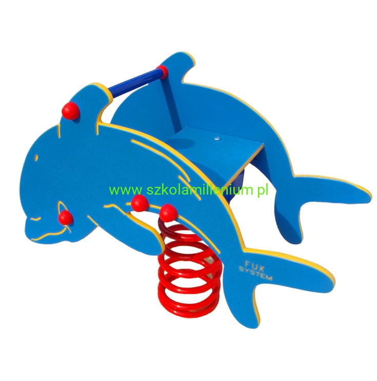 Bujak jednoosobowy zwany sprężynowcem w kształcie DELFINA to urządzenie kołyszące dla najmłodszych dzieci, idealne uzupełnienie placu zabaw. Korpus wykonany z płyty HDPE barwionej w masie, co daje całkowitą odporność na odbarwienia i promieniowanie UV, natomiast elementy metalowe to stal potrójnie zabezpieczona antykorozyjnie poprzez cynkowanie ogniowe, chromianowanie i malowanie proszkowe powłoką poliestrową. Bujak z uchwytami dla rąk, podparciem dla nóg i panelami z wizerunkiem delfina z dwóch stron, które chronią przed upadkiem, przytwierdzony jest do sprężyny stalowej i mocowany do gruntu kotwą stalową.