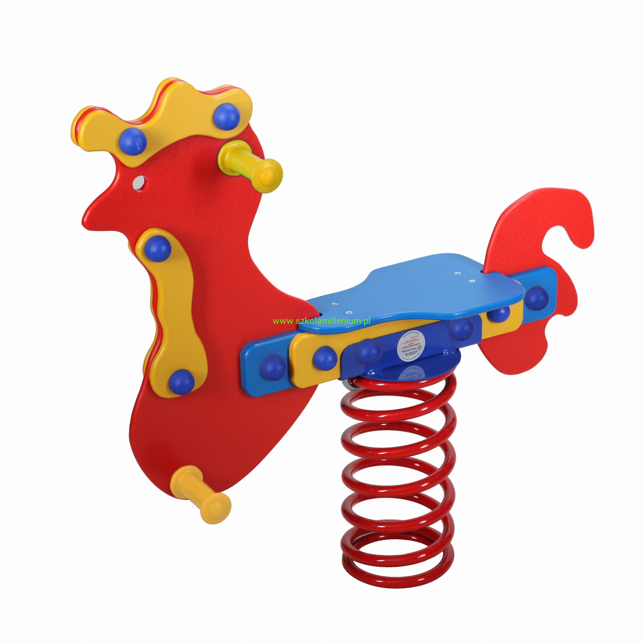 Bujak jednoosobowy zwany sprężynowcem w kształcie KOGUTA to urządzenie kołyszące uwielbiane są przez dzieci, idealne uzupełnienie placu zabaw. Korpus wykonany z płyty HDPE barwionej w masie, co daje całkowitą odporność na odbarwienia i promieniowanie UV, natomiast elementy metalowe to stal potrójnie zabezpieczona antykorozyjnie poprzez cynkowanie ogniowe, chromianowanie i malowanie proszkowe powłoką poliestrową. Bujak z uchwytami dla rąk i podparciem dla nóg, przytwierdzony do sprężyny stalowej i mocowany do gruntu kotwą stalową.