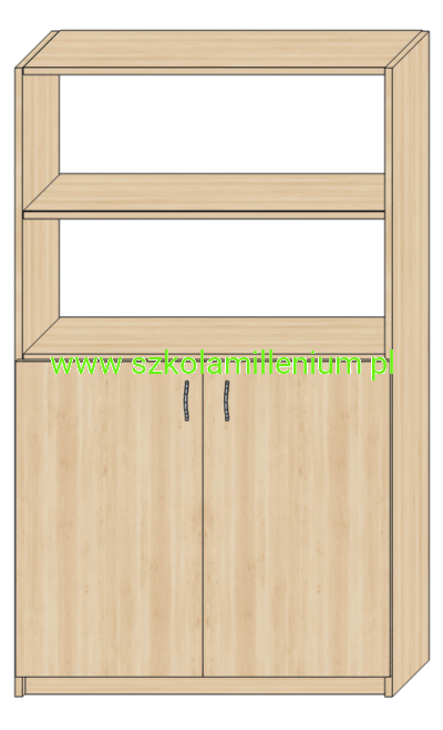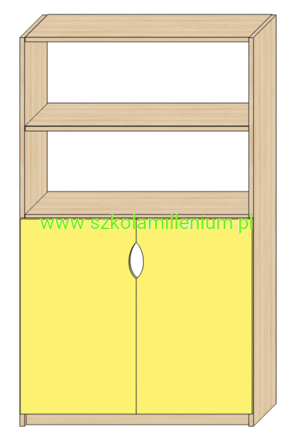 Szafka w dolnej części posiada dwa fronty zamykane z dwoma półkami w środku, powyżej dwie półki otwarte.