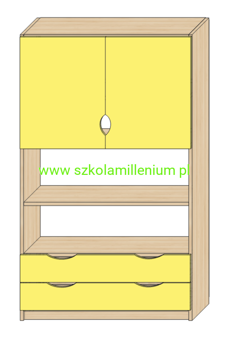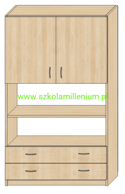 Szafka w dolnej części z dwoma szufladami na prowadnicach kulowych, powyżej dwie półki otwarte,