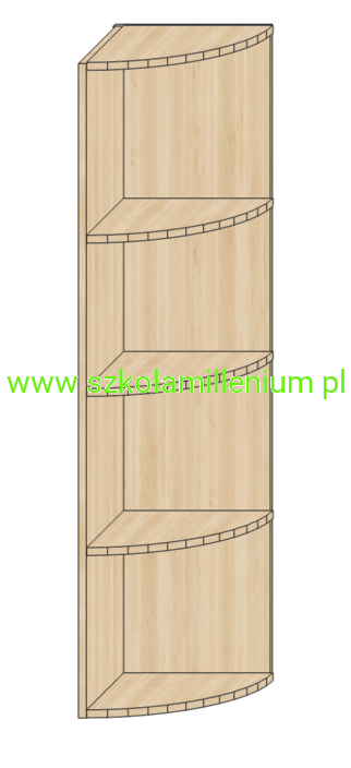 Szafka narożna z czterema otwartymi półkami i regulacją wysokości.