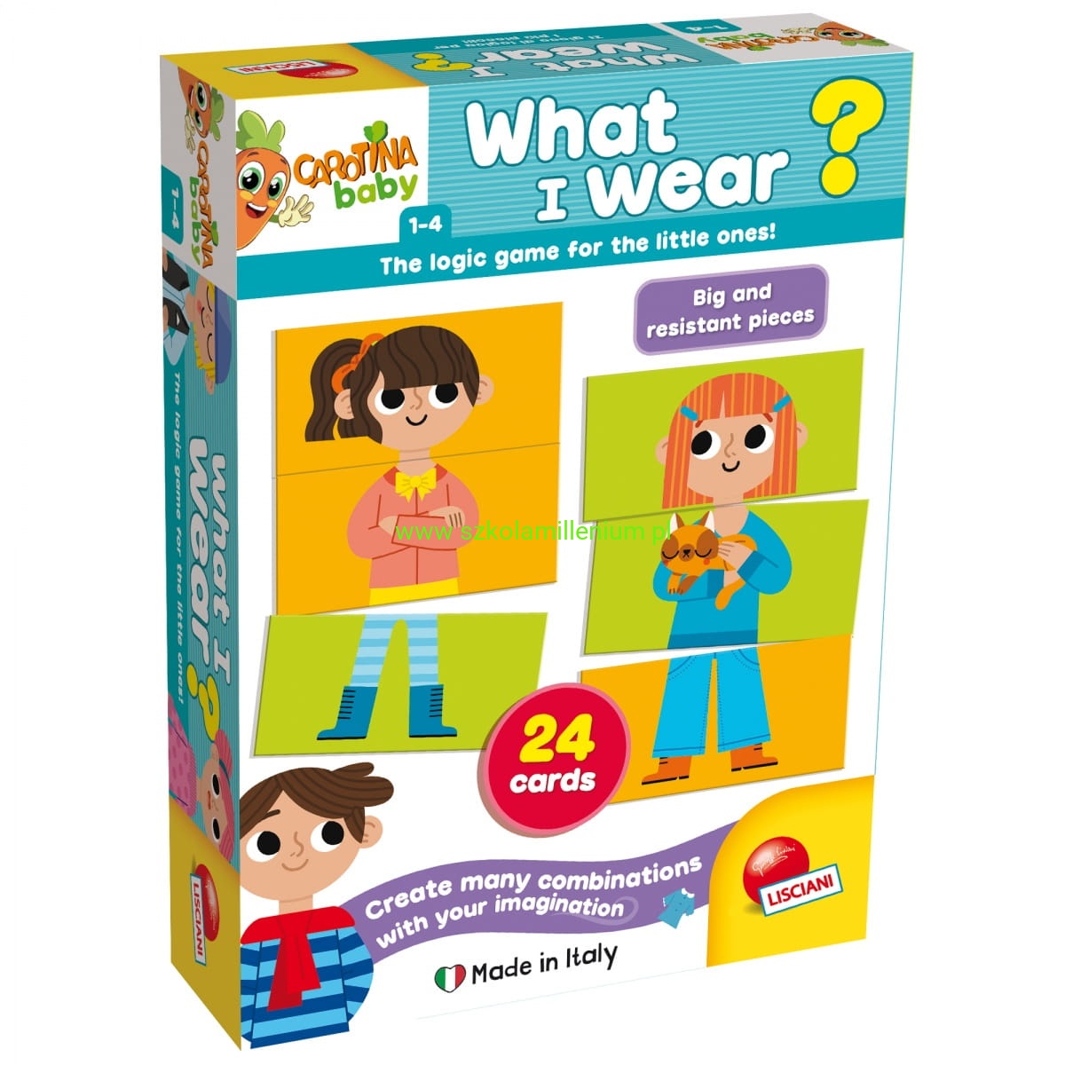 Zestaw edukacyjny włoskiego producenta Lisciani, dzięki któremu dzieci poznają ubrania, bawiąc się w grę logiczną, dzięki której mogą dopasowywać do siebie różne elementy. Opakowanie zawiera duże i wytrzymałe puzzle wysokiej jakości. Seria Carotina Baby pozwala dzieciom na zaspokojenie ich naturalnej ciekawości i poznanie otaczającego ich świata. Różne zestawy wprowadzają pierwsze zagadnienia, takie jak cyfry, kształty, kolory i emocje. Dzięki 8 sylwetkom, dzieci mogą tworzyć wiele różnorodnie ubranych postaci, dobierając karty z ubiorem.