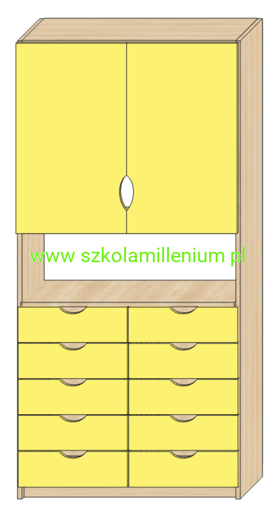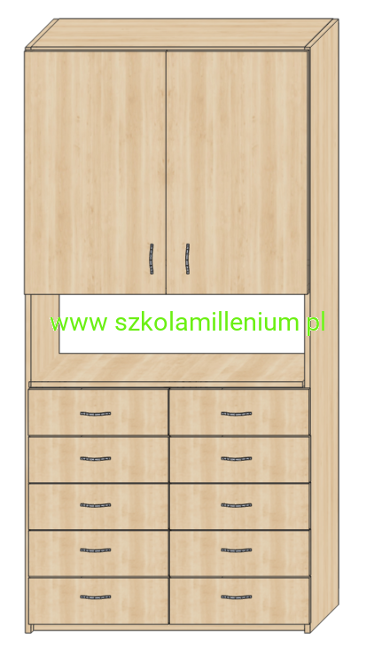 Szafka w dolnej części posiada dziesięć szuflad na prowadnicach kulowych, powyżej półka otwarta i dwa zamykane