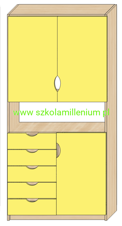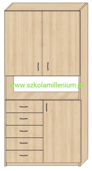 Szafka w dolnej części posiada front zamykany z dwoma półkami w środku oraz pięć szuflad na prowadnicach