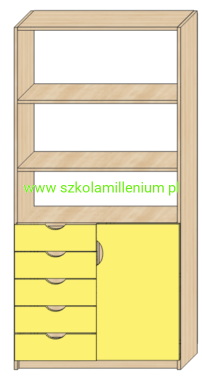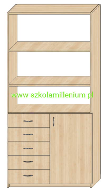 Szafka w dolnej części posiada front zamykany z dwoma półkami w środku oraz pięć szuflad na prowadnicach kulowych, powyżej trzy półki otwarte.