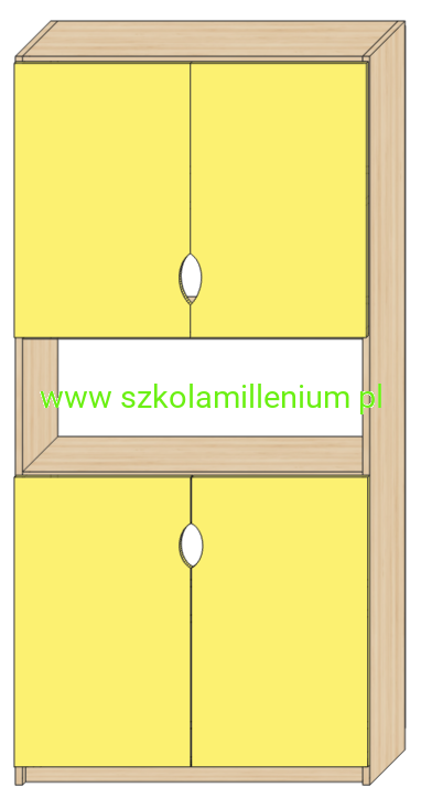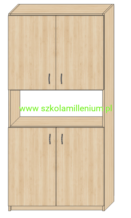 Szafka w dolnej części posiada dwa fronty zamykane z dwoma półkami w środku, powyżej półka otwarta, w górnej części kolejne dwa fronty zamykane z dwoma półkami w środku.