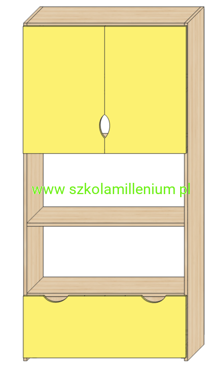 Szafka w dolnej części z kontenerem wysuwanym na kółkach, powyżej dwie otwarte półki, w górnej części dwa fronty zamykane z dwoma półkami w środku.
