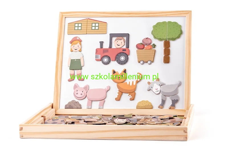 Magnetyczny dwustronny stolik z drewnianymi puzzlami o tematyce zwierząt i ludzi. Z jednej strony znajduje się powierzchnia do pisania kredą, z drugiej biała powierzchnia magnetyczna do pisania markerem. Różnorodność elementów (głowy, ciała, nogi, części budynków, rośliny...), z których dzieci mogą tworzyć nieskończone wariacje obrazków pełnych wyobraźni. Puzzle wspierają wyobraźnię i rozwój motoryki małej.