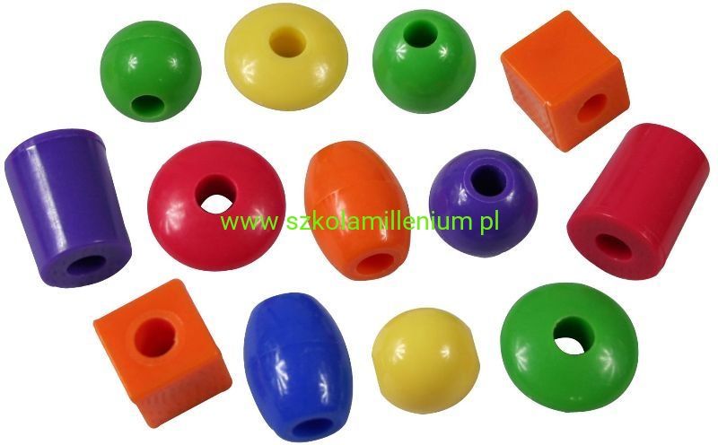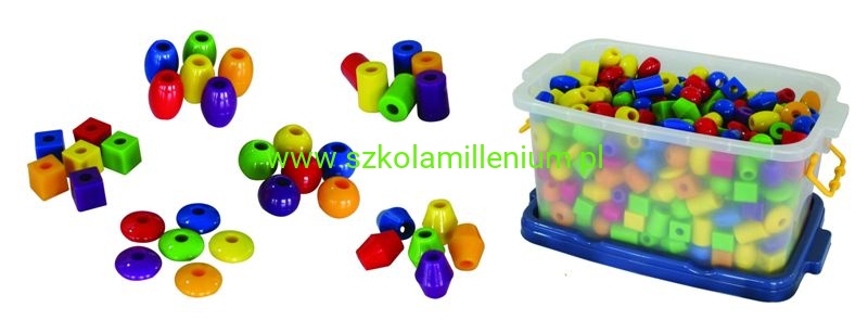 Koraliki występują w podstawowych kolorach: czerwonym, pomarańczowym, żółtym, zielonym i niebieskim i kształtach: kule, cylindry, kostki, trójkąty. 82-częściowy zestaw korali zawiera 8 sznurków do nawlekania. Każdy koralik ma szerokie otwory ułatwiające nawlekanie i ma idealny rozmiar dla małych rączek do manipulowania. Koraliki można przechowywać w dołączonym pojemniku z zamykaną pokrywą i uchwytami i są idealnym dodatkiem do sal lekcyjnych, przedszkoli i środowiska domowego.