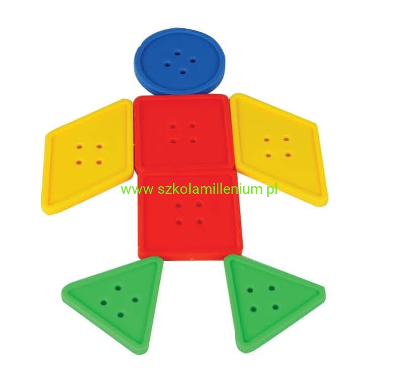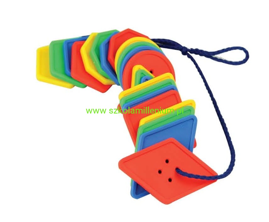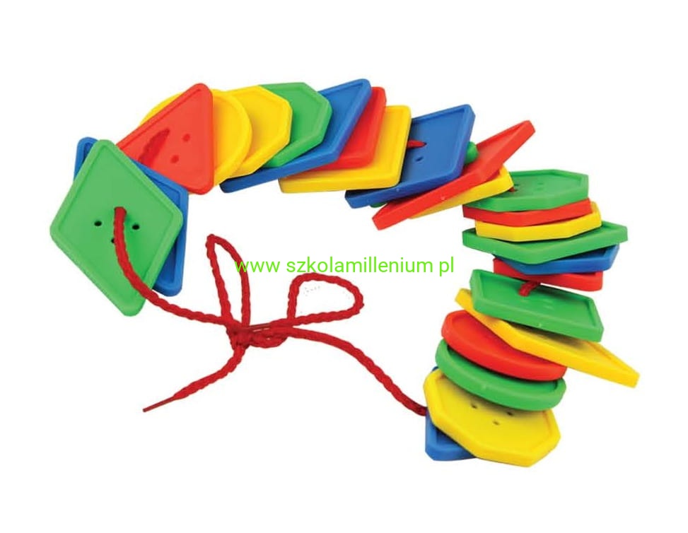 Kolorowe figury geometryczne: kwadraty, koła, trójkąty, romby do nawlekania, przewlekania i dowolnego łączenia, zapewniają dziecku kreatywne zajęcia, angażują na długi czas oraz rozwijają zdolności manualne i doskonalą precyzję ruchów.