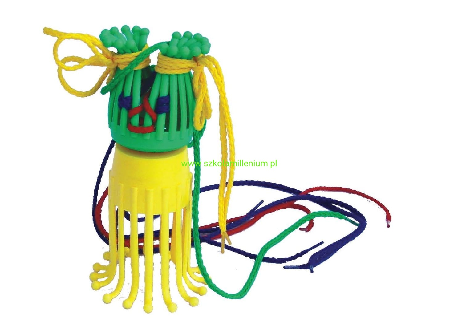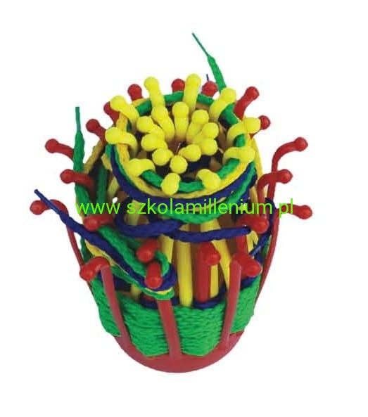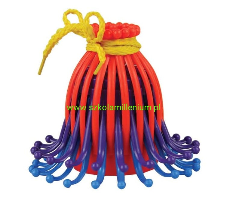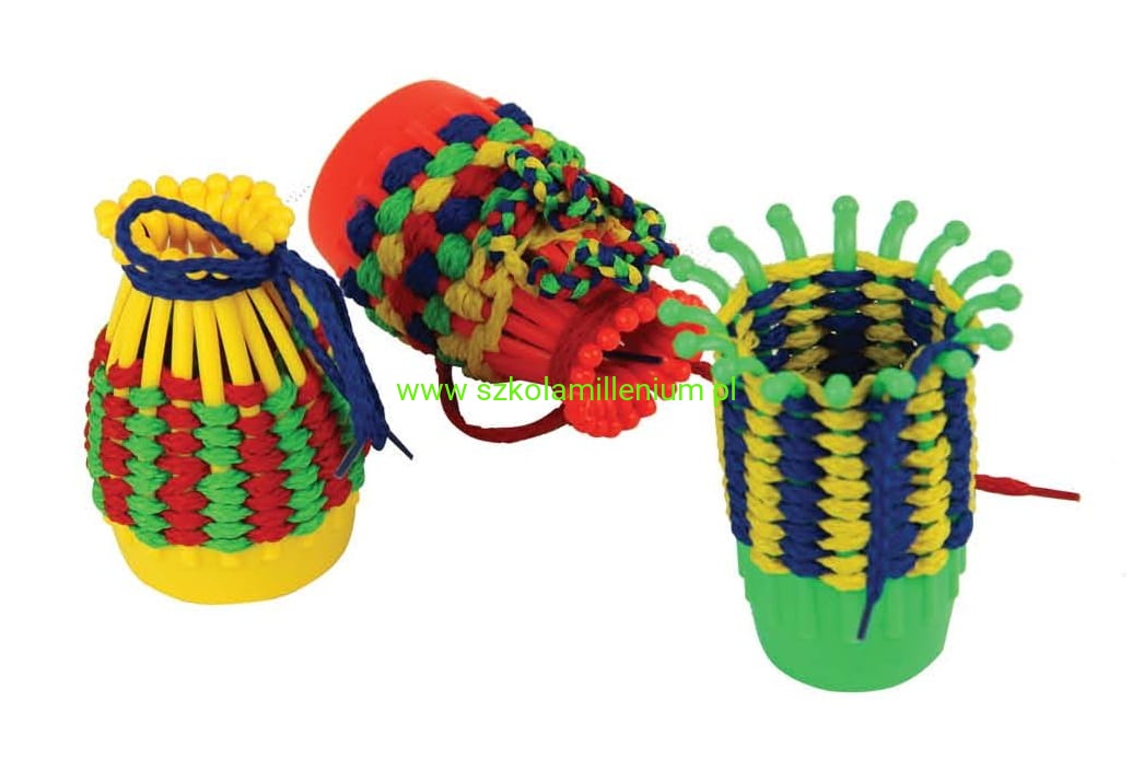 Kolorowe elastyczne koszyczki, które oplatając sznurkami, tworzymy różnorakie konstrukcje. Zabawa kształtuje rozwój wyobraźni przestrzennej u dzieci, kreatywność, zdolności manualne, doskonalą precyzję ruchów oraz logiczne myślenie. Zestaw zawiera koszyczki oraz kolorowe sznurki do przeplatania. Wszystkie elementy w pięciu kolorach: czerwony, niebieski, żółty, zielony, pomarańczowy. Całość przechowujemy w dołączonym pojemniku z zamykaną pokrywą i uchwytami. To idealny dodatek do sal lekcyjnych, przedszkoli oraz środowiska domowego.