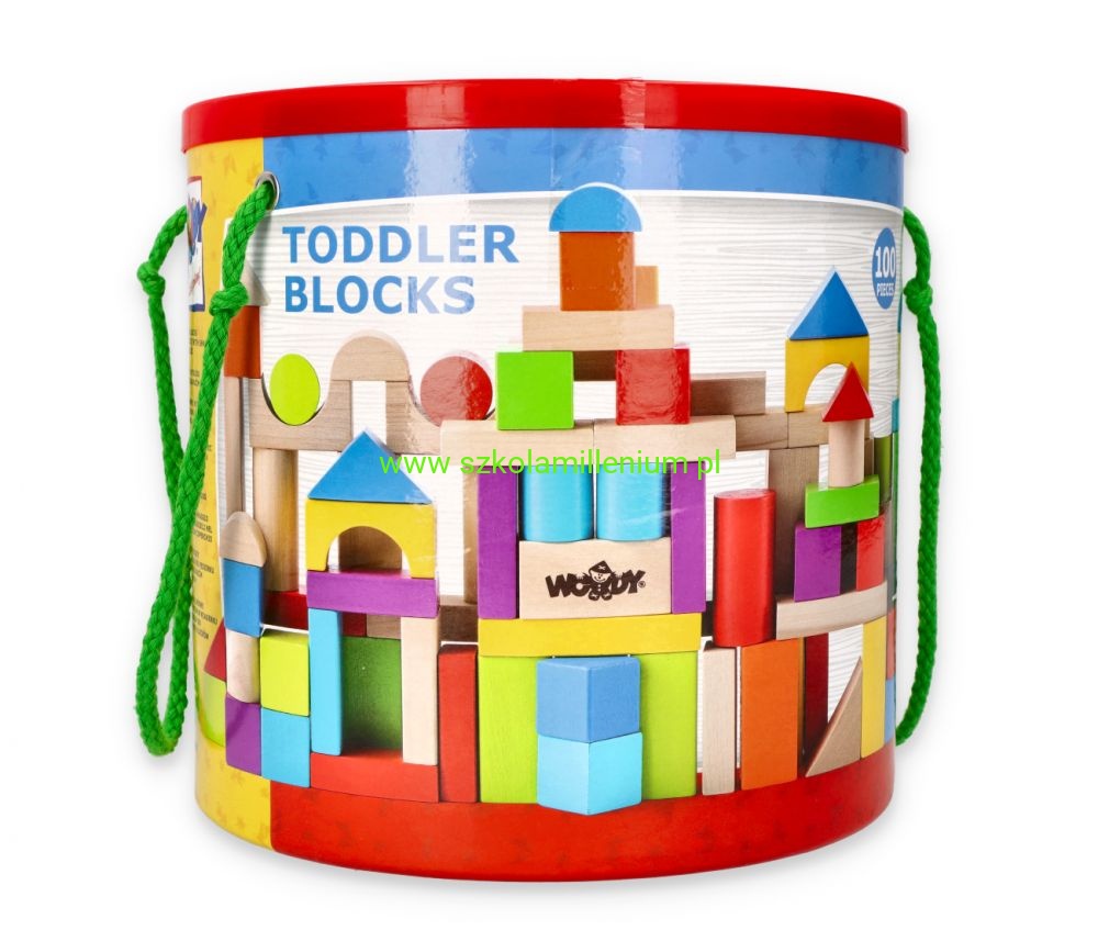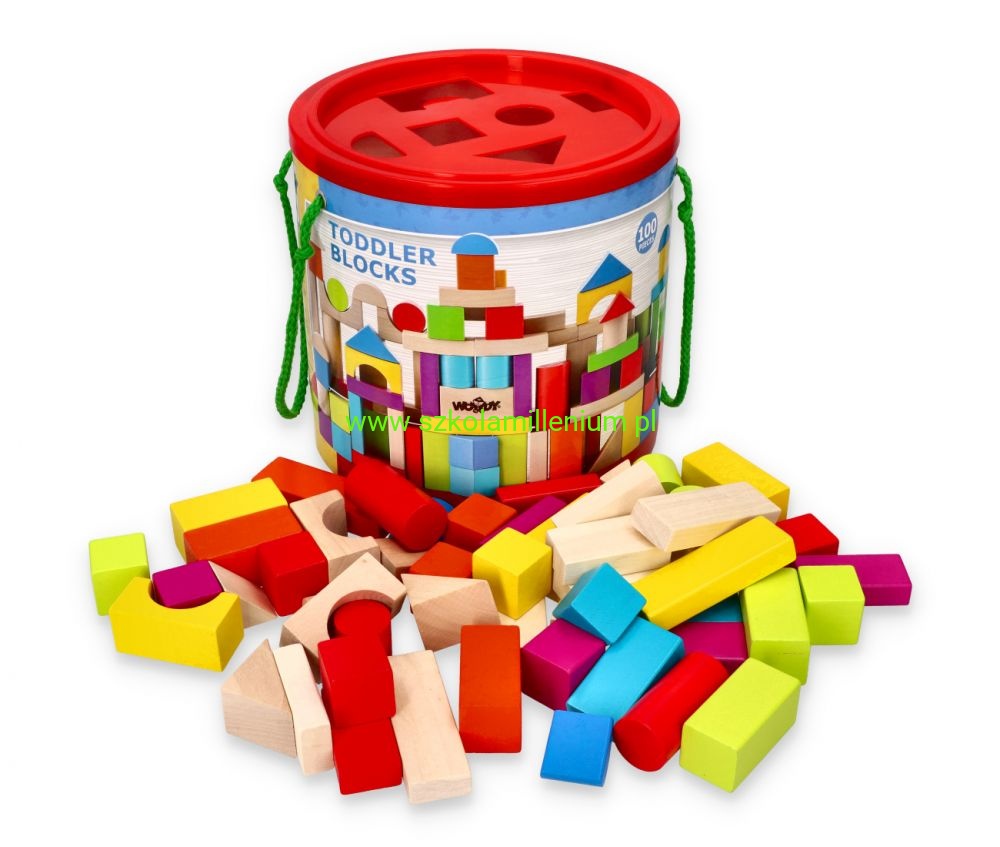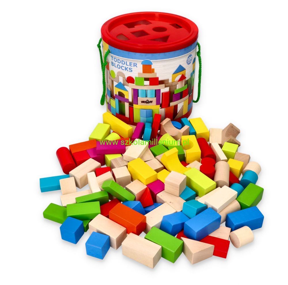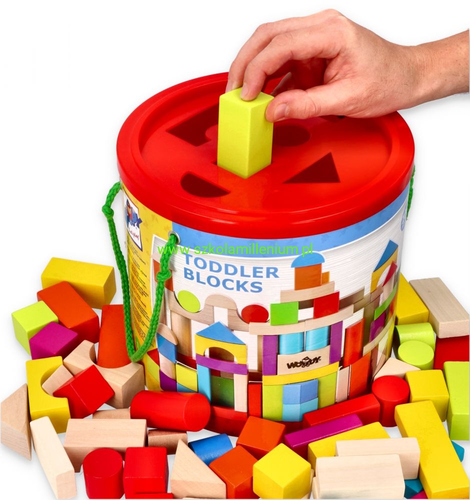 Zabawka z ekologicznego materiału jakim jest drewno, która kształtuje i rozwija zdolności motoryczne. Rozwija w dziecku wyobraźnię oraz ćwiczy cierpliwość i precyzję. Klocki w kolorze naturalny oraz intensywny takim jak czerwony, żółty, niebieski, zielony, pomarańczowy, fioletowy i różowy. Wiaderko z sorterem w pokrywie u góry, to dodatkowa dla dziecka zabawa przy wrzucaniu i odpowiednim doborze klocka do otworu. Wiaderko ma po dwóch bokach doczepione uchwyty ze sznurka, żeby łatwo je było przenosić. Klocki idealnie sprawdzą się do sal przedszkolnych, świetlic oraz środowisk domowych.