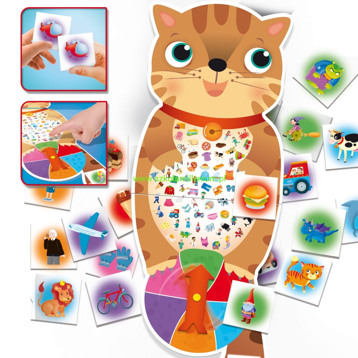 Zestaw edukacyjny, który umożliwia dzieciom rozgrywkę w dwie gry – klasyczną grę pamięciową, w której rozpoznawane są pary takich samych obrazków i obserwacyjną, do której używany jest spinner. Zestawy jest skonstruowany w taki sposób, aby dostarczyć dzieciom zarówno zabawy, jak i edukacji, wspierając rozwój różnorodnych umiejętności. Dzieci rozwijają pamięć i koncentrację, a także uczą się zabawy w grupie. Zestaw zawiera 144 karty, spinner oraz planszę w kształcie kota.