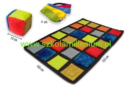 Dzięki dołączonej do zestawu kostce oraz opaskom na oczy można poszerzyć i urozmaicić zakres zabaw z użyciem maty. Kostka znajdująca się w zestawie wykonana jest z kilku rodzajów tkanin, każda o innej strukturze i w innym kolorze - adekwatnie do maty, wypełniona miękką kulka silikonową, dzięki czemu jest bezpieczna i przyjemna w dotyku.