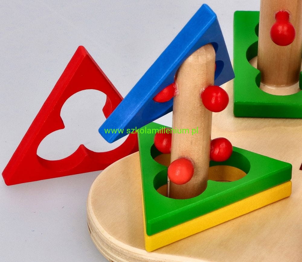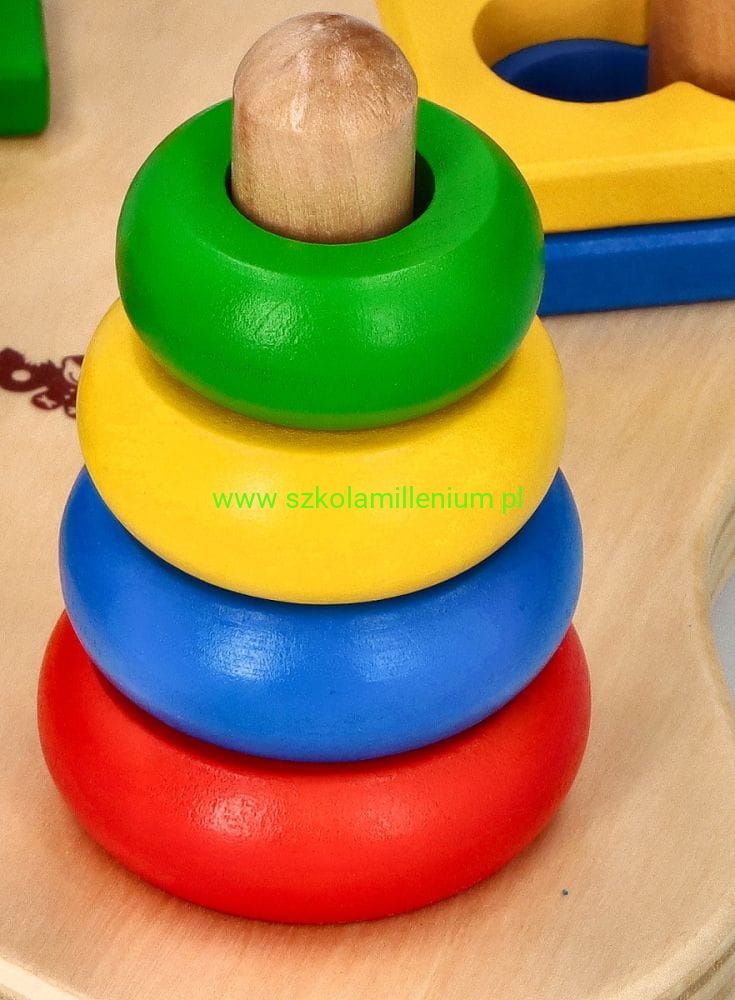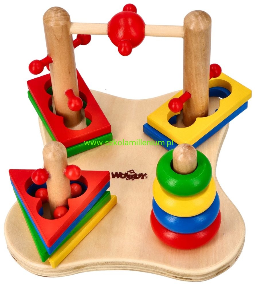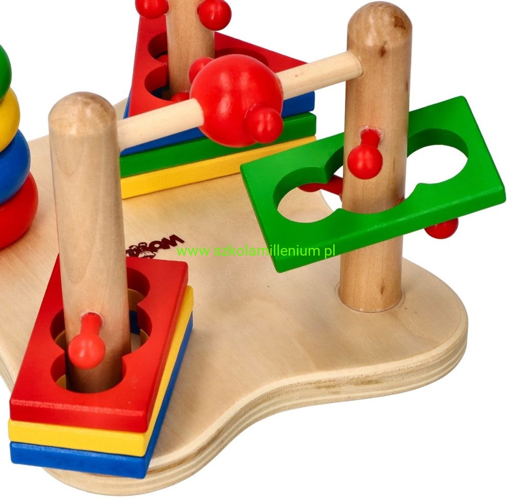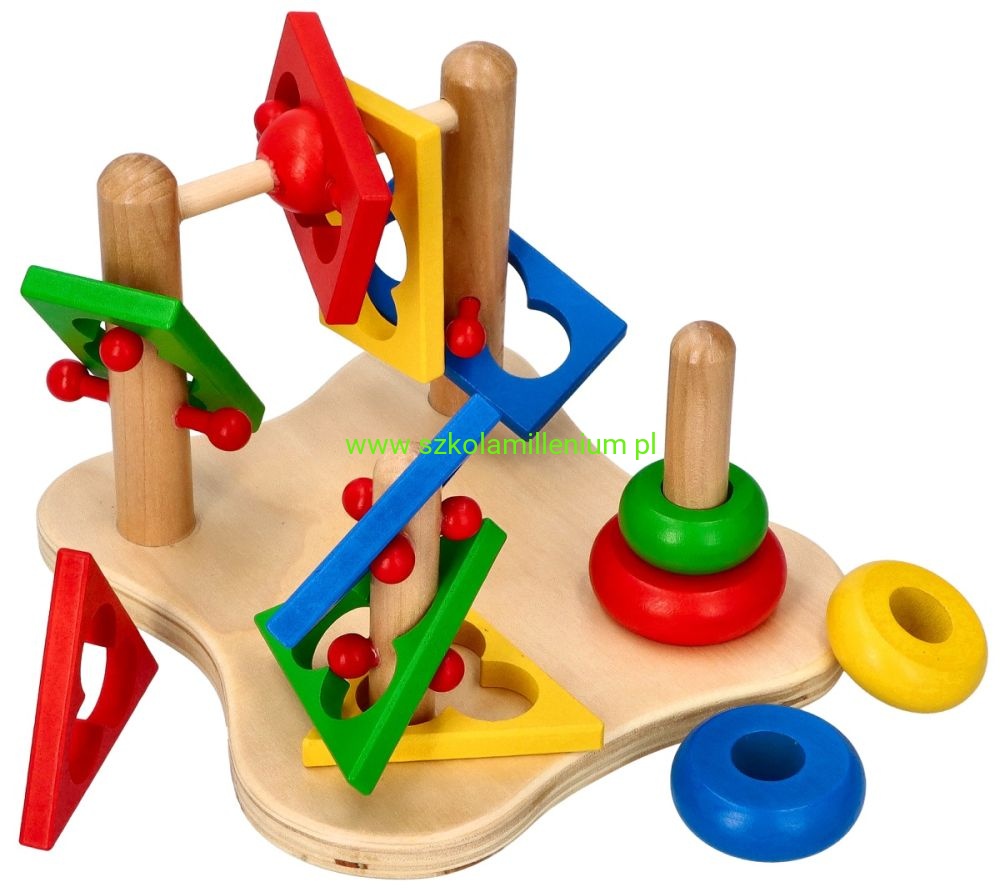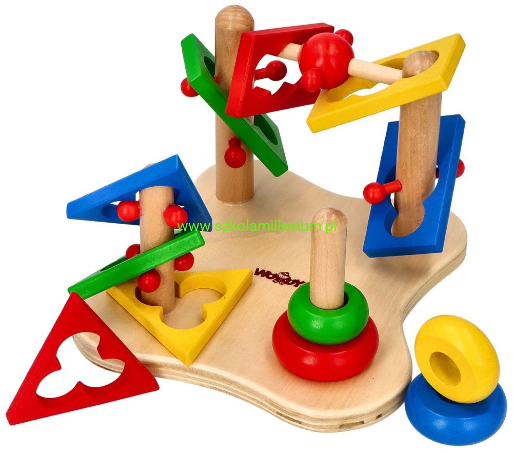 Układanka drewniana, która z jednej strony posiada dwie piramidki, a z drugiej strony pętle, co przyczyni się do rozwoju koordynacji ręka-oko i motoryki malucha. Dziecko ma trafić na palik i ułożyć krążki w odpowiedniej kolejności, kolejne zadanie, to przełożyć elementy z jednej strony na drugą, zmieniając położenie klocków. Układanka dodatkowo uczy rozpoznawać kształty i kolory: koło, prostokąt i trójkąt. Zabawka edukacyjna, więc doskonale sprawdzi się jako wyposażenie sal przedszkolnych, czy terapeutycznych.
