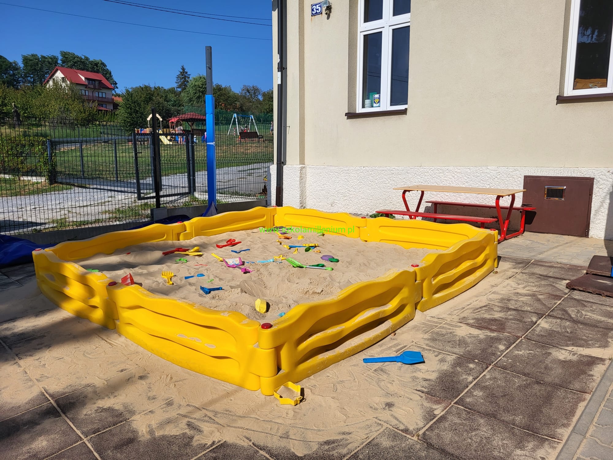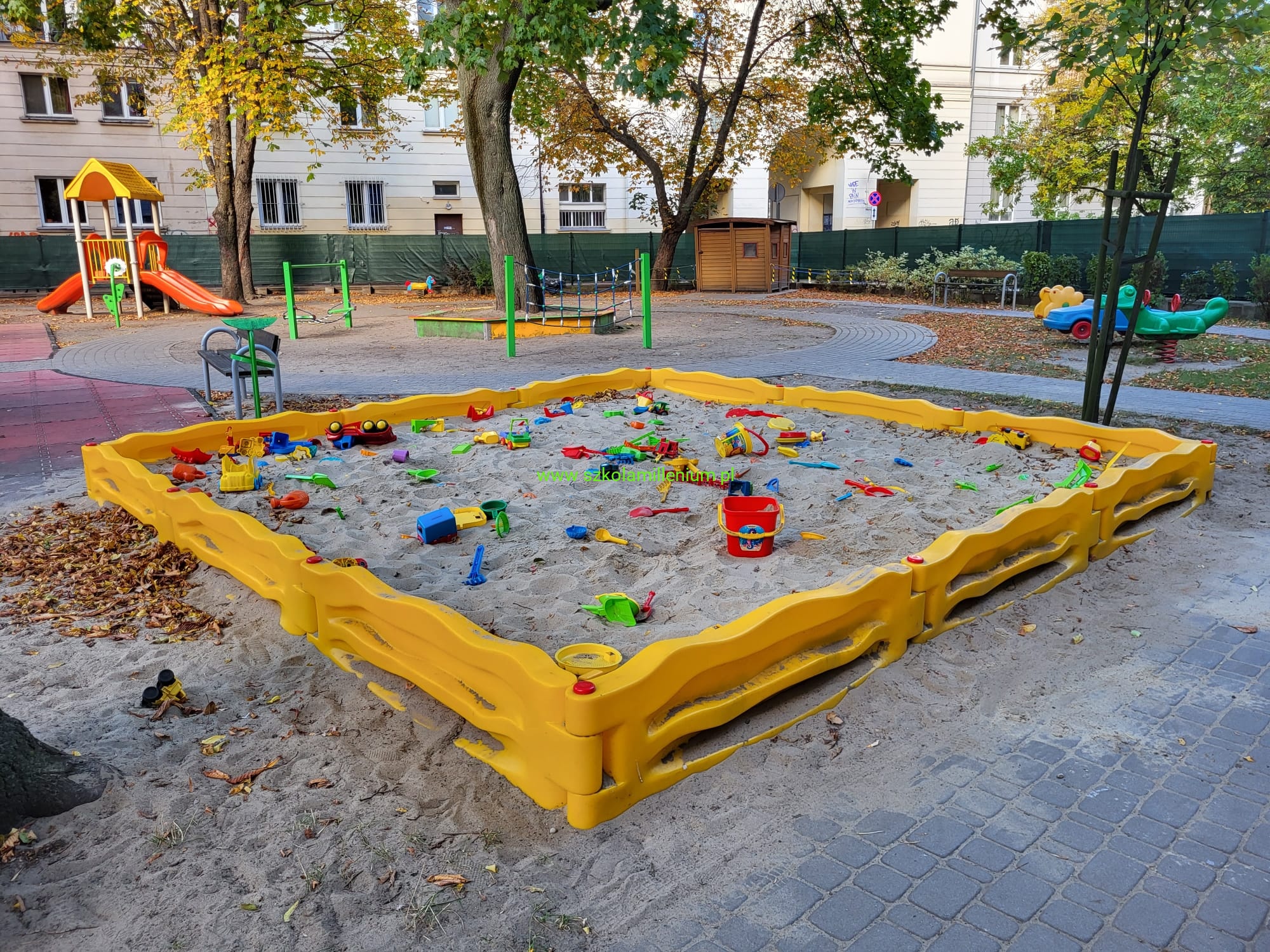 Boki piaskownicy ze względu na swoją grubość mogą służyć jako siedziska dla dzieci.