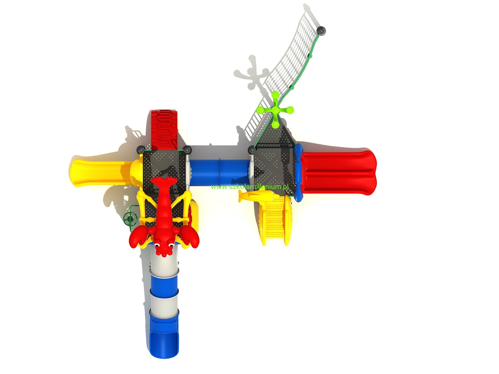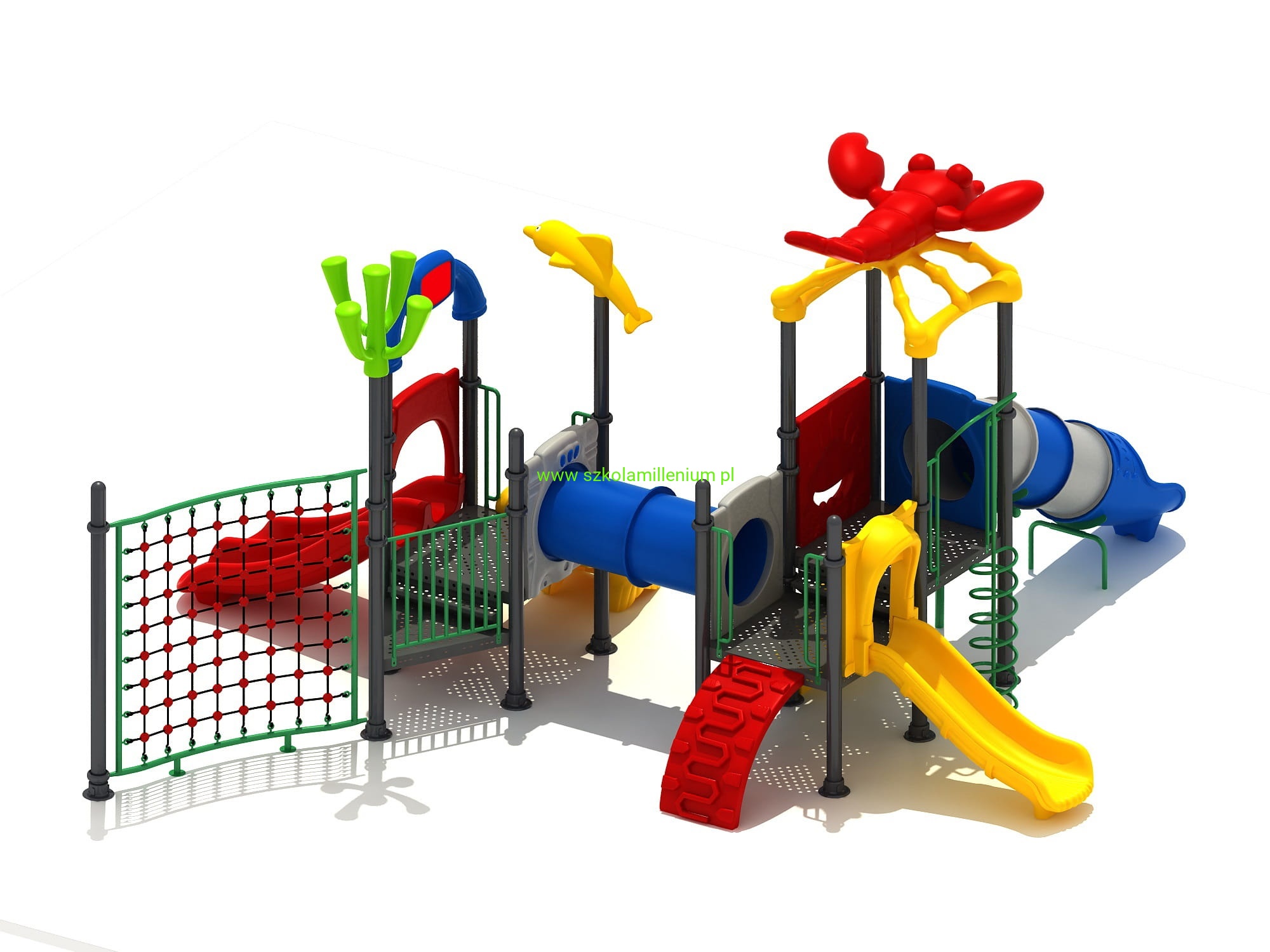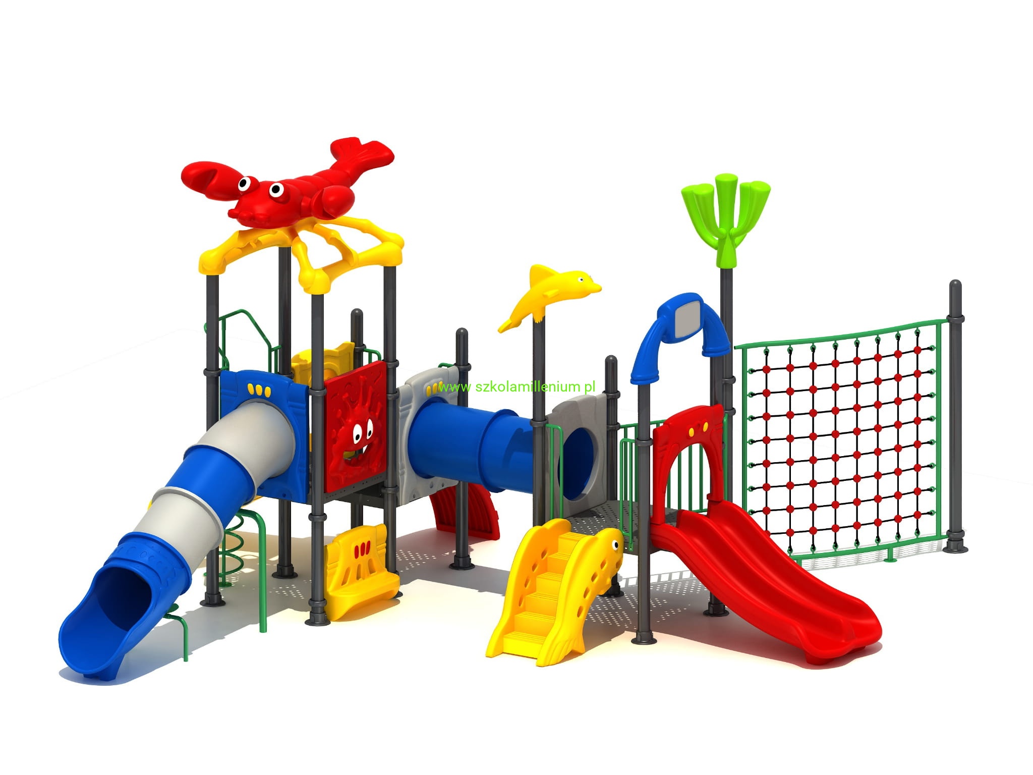 Zestaw składa się z kilku podestów, schodków, wejścia - koci grzbiet, tunelu, siatki wspinaczkowej i zjeżdżalni: rurowej, prostej, podwójnej, które zapewnią najmłodszym wiele godzin świetnej zabawy. Plac posiada wiele elementów dekoracyjnych takich jak daszki oraz panele z tworzywa LLDPE lub HDPE o szerokiej gamie kolorystycznej, które przyciągają uwagę nie tylko najmłodszych.