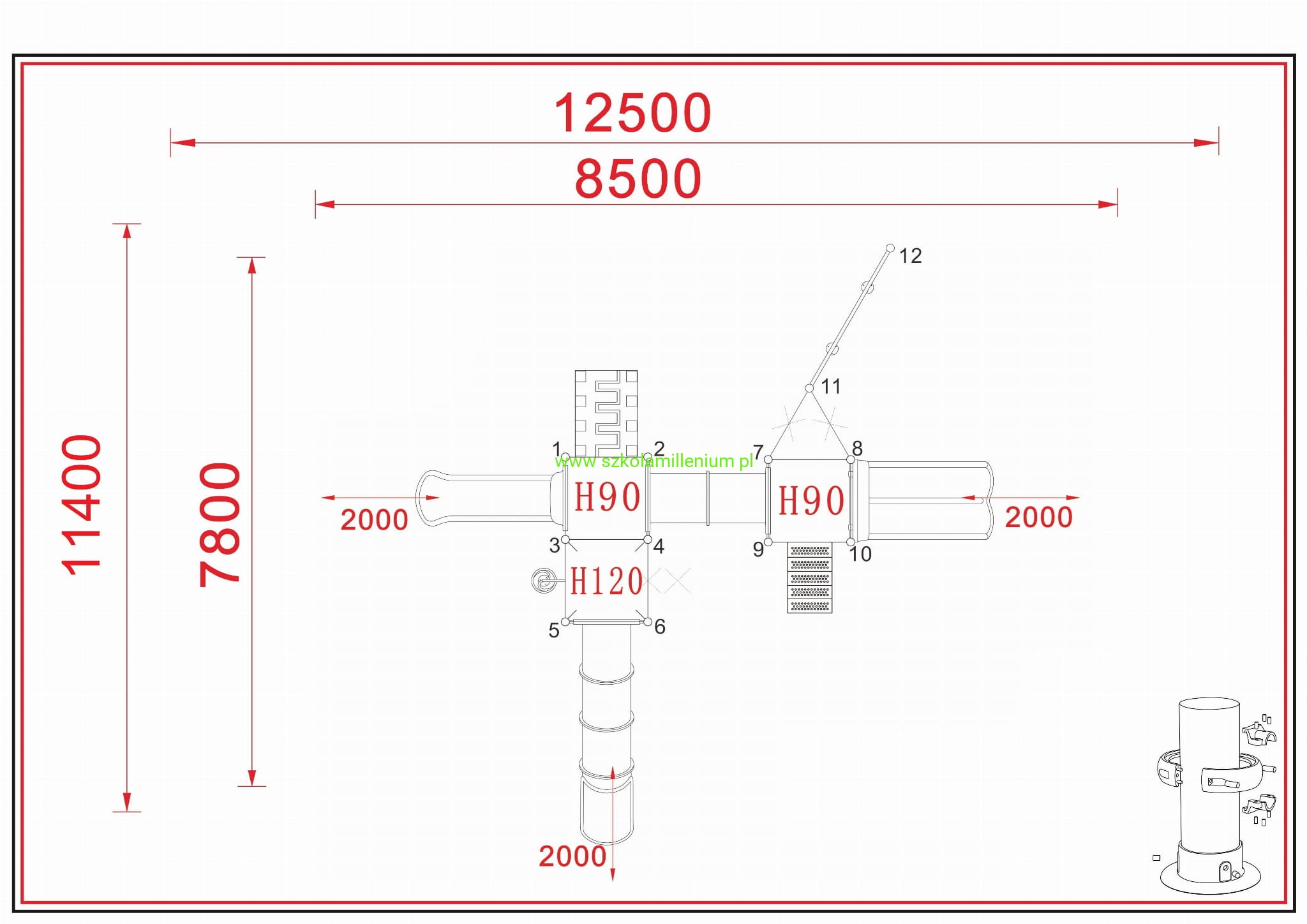 - Wszystkie elementy placu zabaw są łączone za pomocą pierścieni oraz klem i skręcane śrubami. Mocowanie rur z platformą za pomocą dwóch nitonakrętek i dwóch śrub M10.