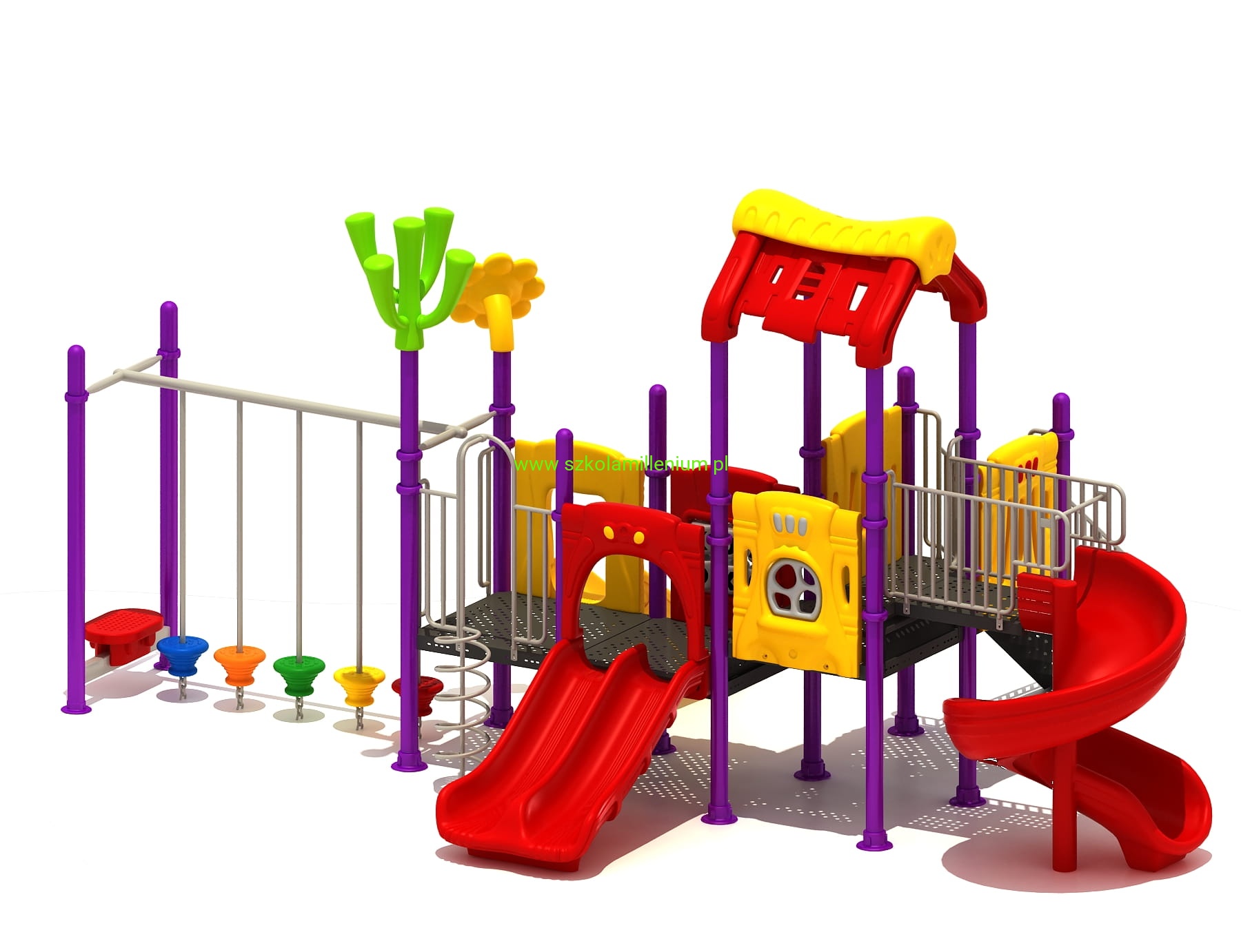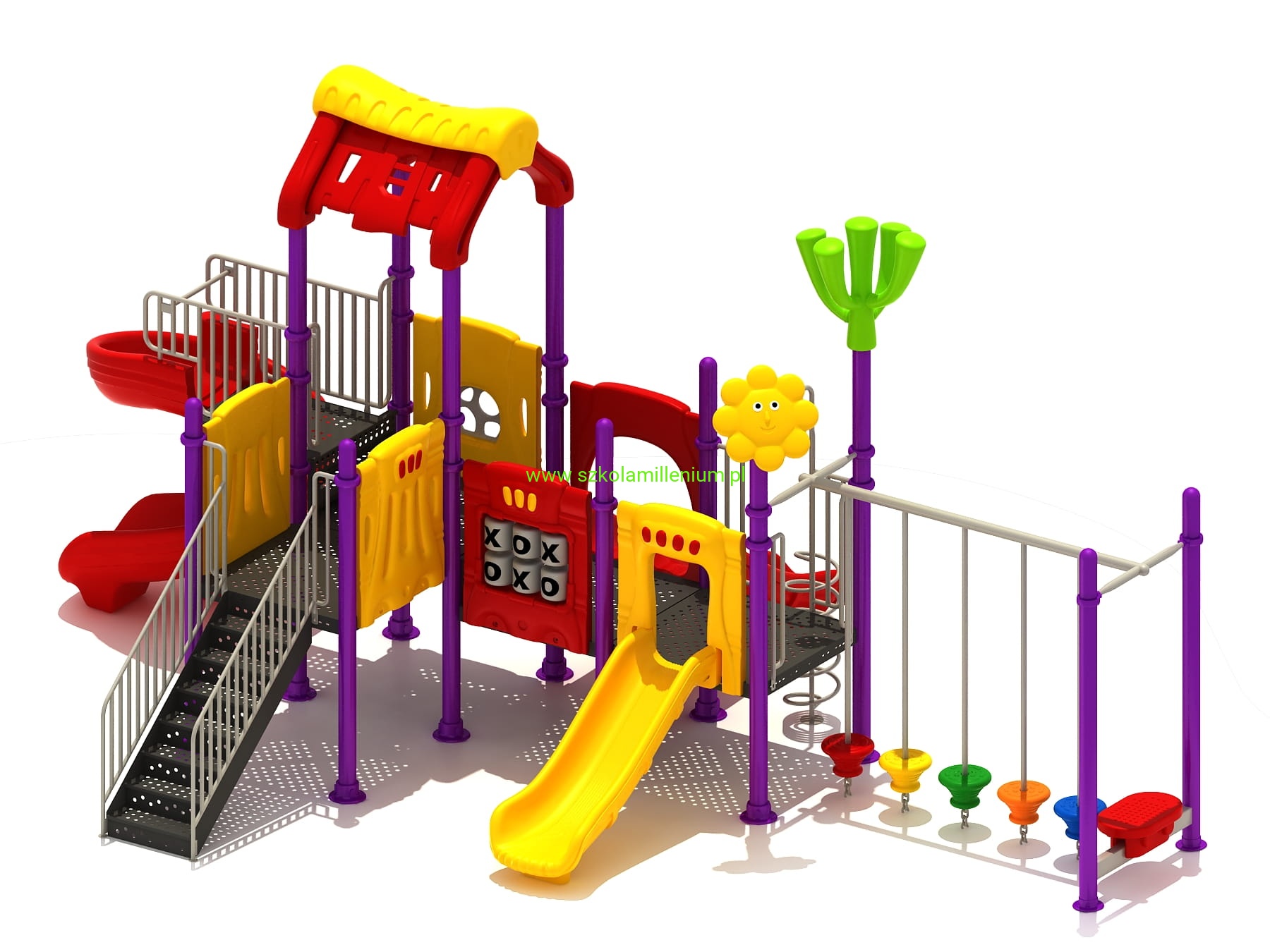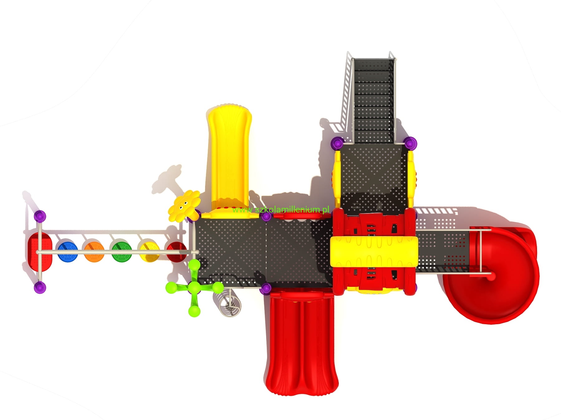 Zestaw składa się z kilku podestów, schodków, panelu kółko i krzyżyk, przejścia składającego się z elementów imitujących kamienie, zjazdu strażackiego i zjeżdżalni: prostej, podwójnej, spiralnej, które zapewnią najmłodszym wiele godzin świetnej zabawy. Plac posiada wiele elementów dekoracyjnych takich jak daszki oraz panele z tworzywa LLDPE lub HDPE o szerokiej gamie kolorystycznej, które przyciągają uwagę nie tylko najmłodszych.