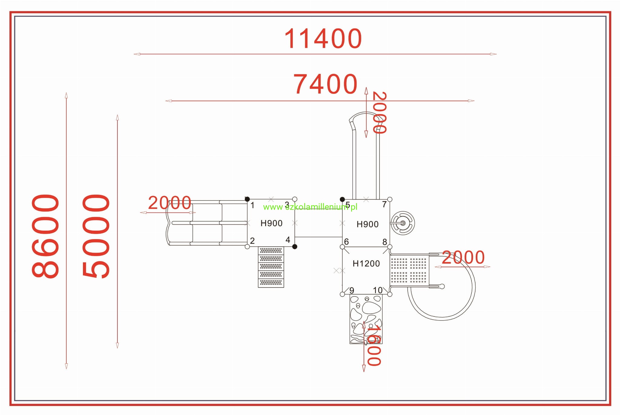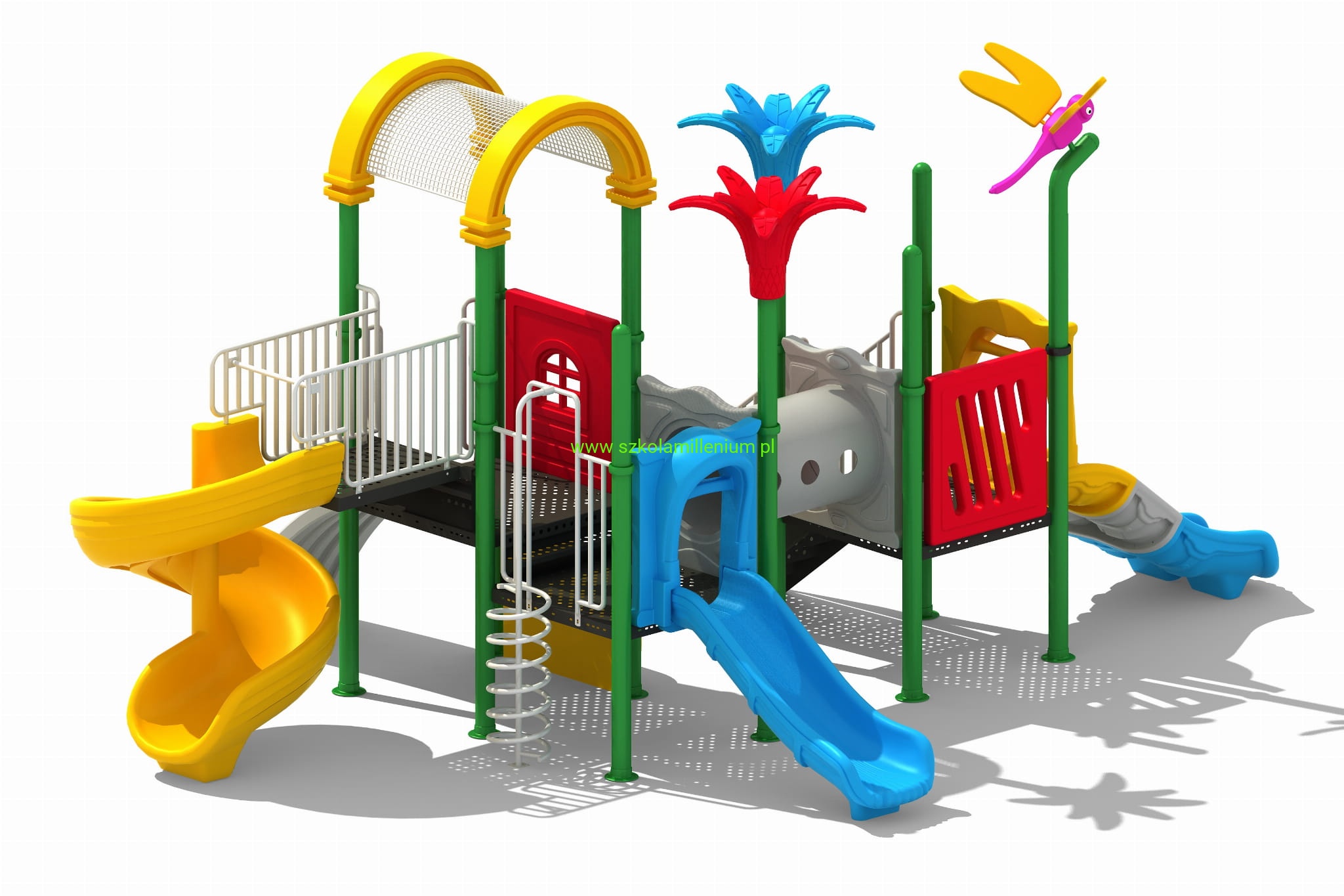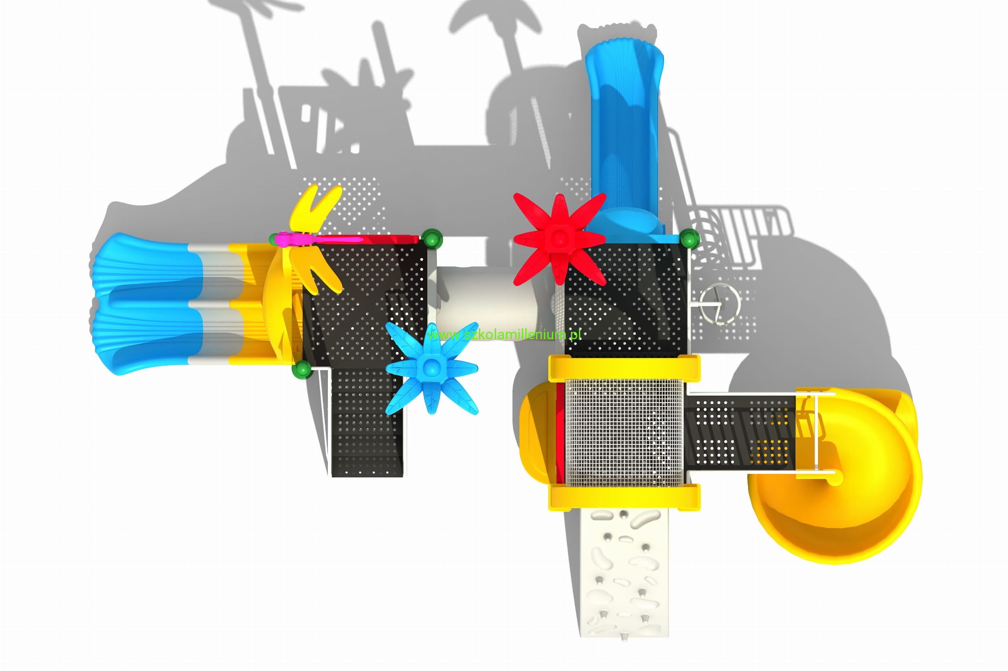 Zestaw składa się z kilku podestów, zjazdu strażackiego, tunelu, wejścia - koci grzbiet, schodków i zjeżdżalni: podwójnej, prostej, spiralnej, które zapewnią najmłodszym wiele godzin świetnej zabawy. Plac posiada wiele elementów dekoracyjnych takich jak daszki oraz panele z tworzywa LLDPE lub HDPE o szerokiej gamie kolorystycznej, które przyciągają uwagę nie tylko najmłodszych.