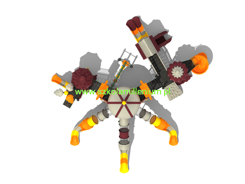- Wszystkie elementy placu zabaw są łączone za pomocą pierścieni oraz klem i skręcane śrubami. Mocowanie rur z platformą za pomocą dwóch nitonakrętek i dwóch śrub M10.