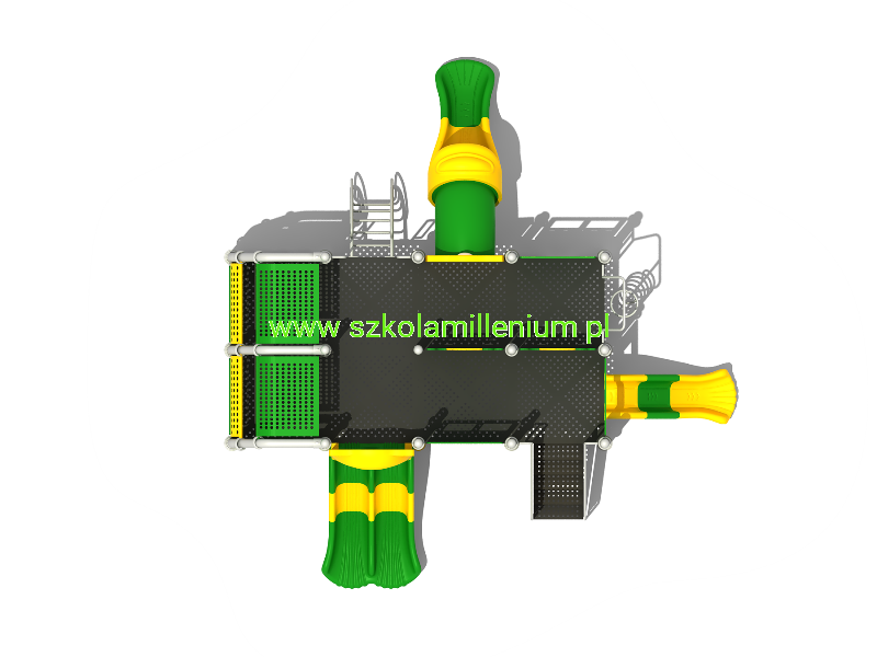 - Wszystkie elementy placu zabaw są łączone za pomocą pierścieni oraz klem i skręcane śrubami. Mocowanie rur z platformą za pomocą dwóch nitonakrętek i dwóch śrub M10.