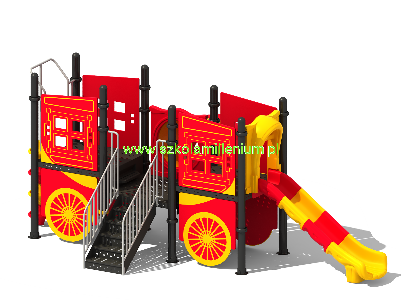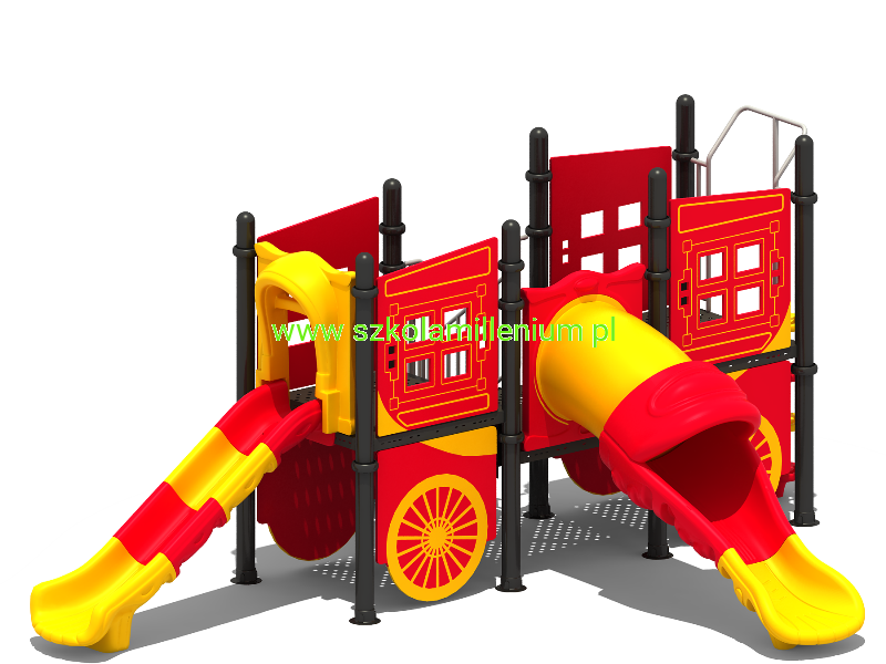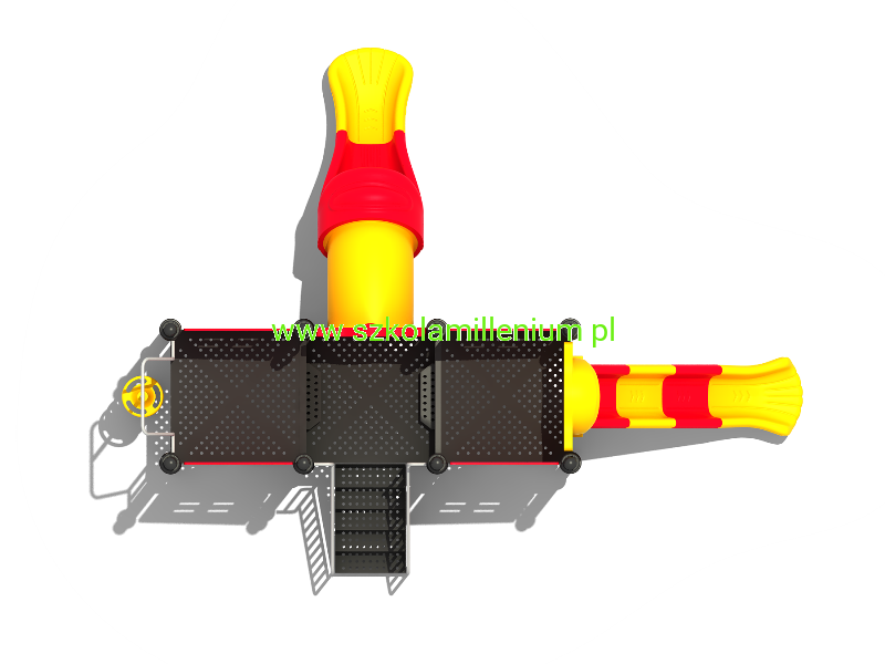 - Wszystkie elementy placu zabaw są łączone za pomocą pierścieni oraz klem i skręcane śrubami. Mocowanie rur z platformą za pomocą dwóch nitonakrętek i dwóch śrub M10.