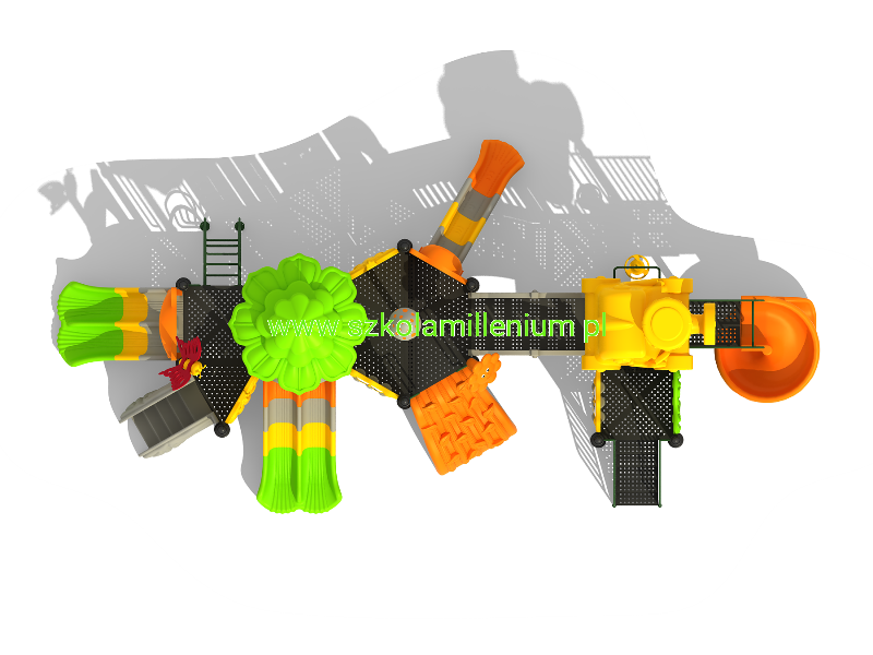 - Wszystkie elementy placu zabaw są łączone za pomocą pierścieni oraz klem i skręcane śrubami. Mocowanie rur z platformą za pomocą dwóch nitonakrętek i dwóch śrub M10.
