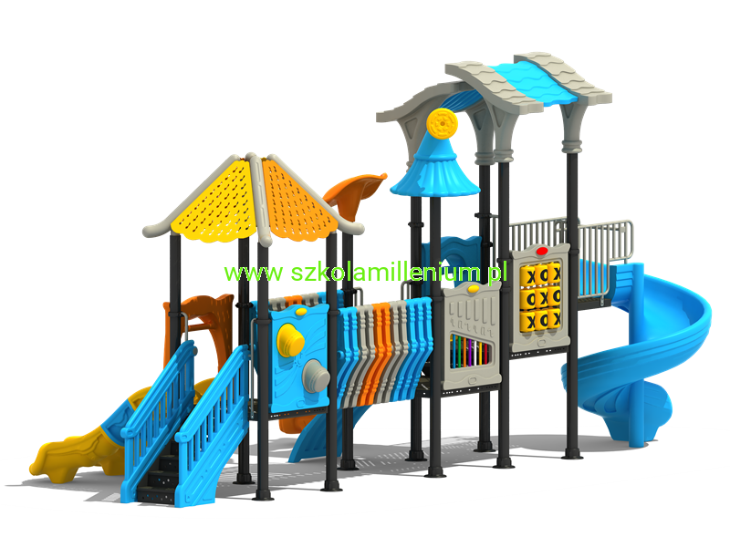 - Wszystkie elementy placu zabaw są łączone za pomocą pierścieni oraz klem i skręcane śrubami. Mocowanie rur z platformą za pomocą dwóch nitonakrętek i dwóch śrub M10.