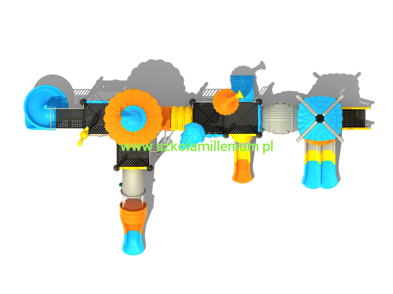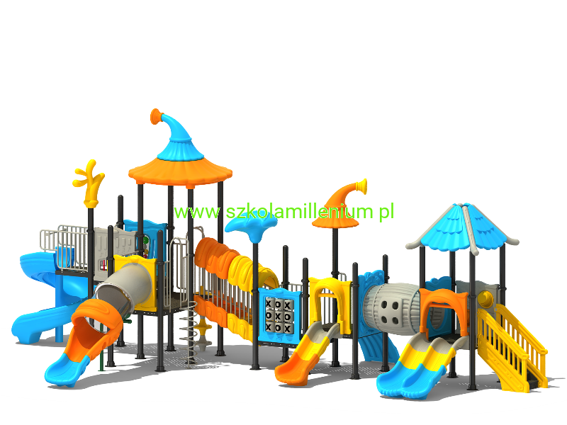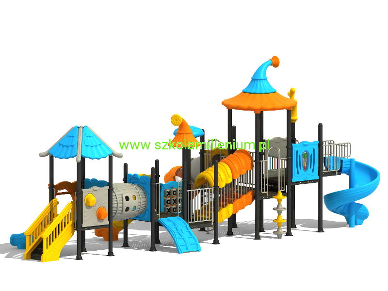 Zestaw składa się z kilku podestów, schodków, wejścia - koci grzbiet, zjazdu strażackiego, tunelu, zjazdu strażackiego typu frisbee, panelu kółko i krzyżyk i zjeżdżalni: podwójnej, prostej, rurowej i spiralnej, które zapewnią najmłodszym wiele godzin świetnej zabawy. Plac posiada wiele elementów dekoracyjnych takich jak daszki oraz panele z tworzywa LLDPE lub HDPE o szerokiej gamie kolorystycznej, które przyciągają uwagę nie tylko najmłodszych.