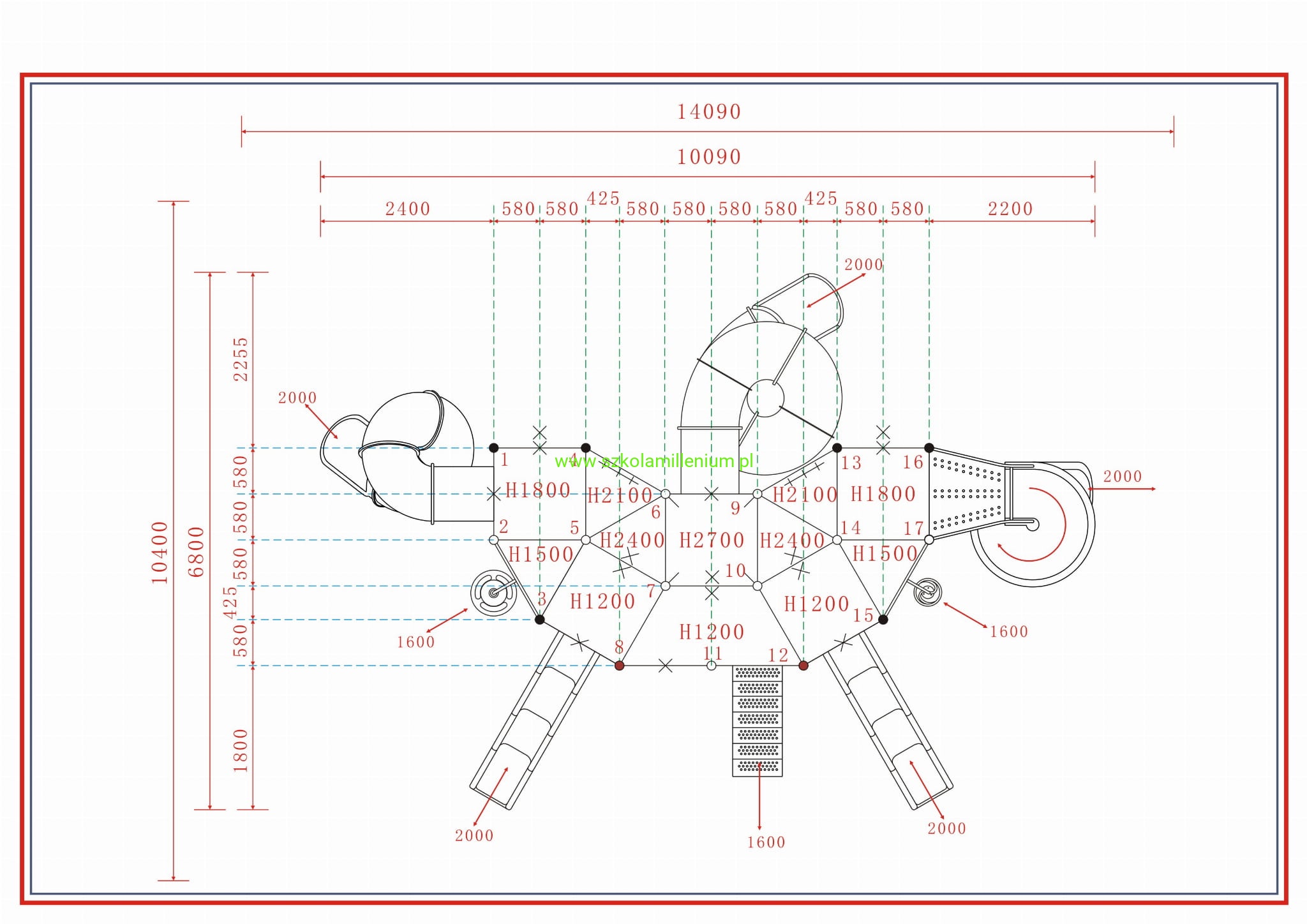 - Materiał: rura stalowa Φ114 mm galwanizowana lakierowana proszkowo, połączenia i obejmy aluminiowe lakierowane proszkowo, platformy wieżyczek pokryte gumą antypoślizgową.