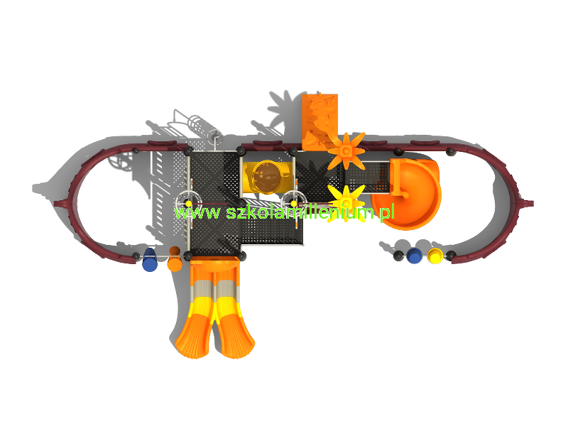 - Wszystkie elementy placu zabaw są łączone za pomocą pierścieni oraz klem i skręcane śrubami. Mocowanie rur z platformą za pomocą dwóch nitonakrętek i dwóch śrub M10.
