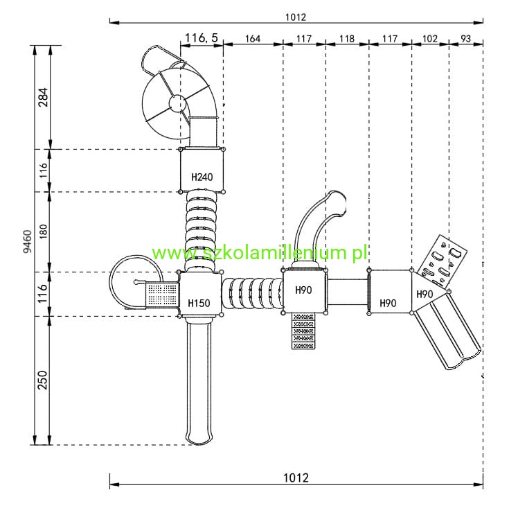 - Wszystkie elementy placu zabaw są łączone za pomocą pierścieni oraz klem i skręcane śrubami. Mocowanie rur z platformą za pomocą dwóch nitonakrętek i dwóch śrub M10.