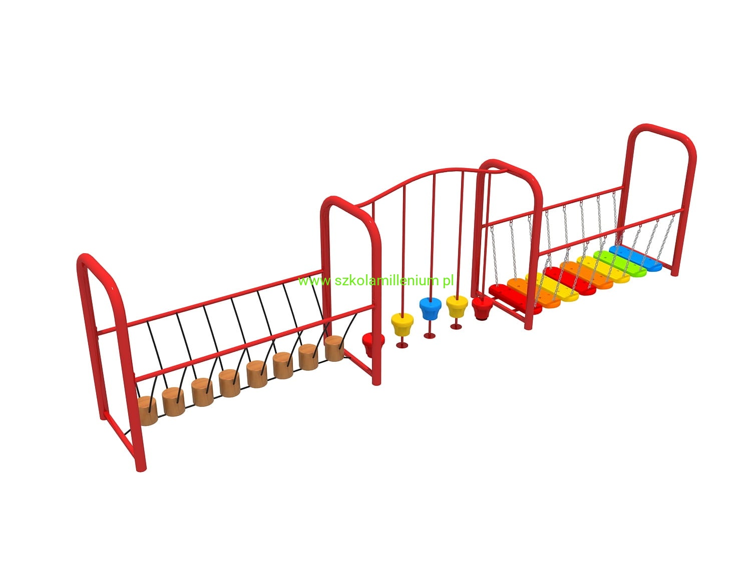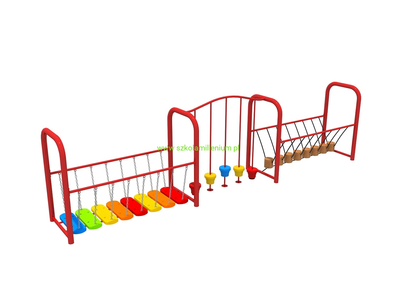 Przejście WN134, to wolnostojące urządzenie o konstrukcji metalowej składające się z trzech sprawnościowych części przeznaczona na plac zabaw. Pierwsza z zawieszonymi na łańcuchach drewnianymi pieńkami do balansowania, druga z elementami imitującymi kamienie do przechodzenia, trzecia z zawieszonymi na łańcuchach ruchomymi kolorowymi stopniami. Konstrukcja umożliwia dzieciom przechodzenie po kołyszących się elementach, rozwijając równowagę, koordynację i odwagę. Wszystkie elementy stalowe są zabezpieczone poprzez cynkowanie i malowanie proszkowe. Stopnie zawieszona na łańcuchach nierdzewnym o krótkich ogniwach. Zabezpieczenia na słupach pionowych wykonane z tworzywa LLDPE barwionego w masie, wszystkie spawy i łączenia są gładkie i odpowiednio wyprofilowane.