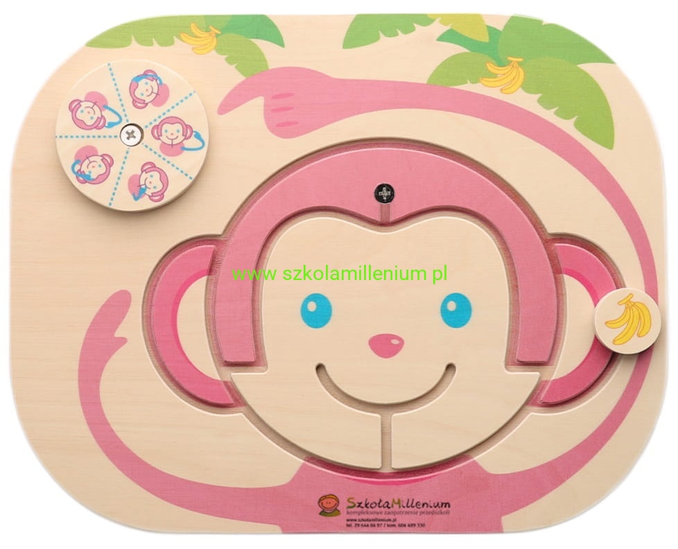Drewniana tabliczka przedstawiająca wesołą małpkę. Po zakręceniu kółkiem maluch losuje część ciała, którą musi wskazać na rysunku niżej i podać jej nazwę, przesuwając klocek wyznaczonymi torami. Dzieci poznają części ciała wraz z wesołą małpką.
