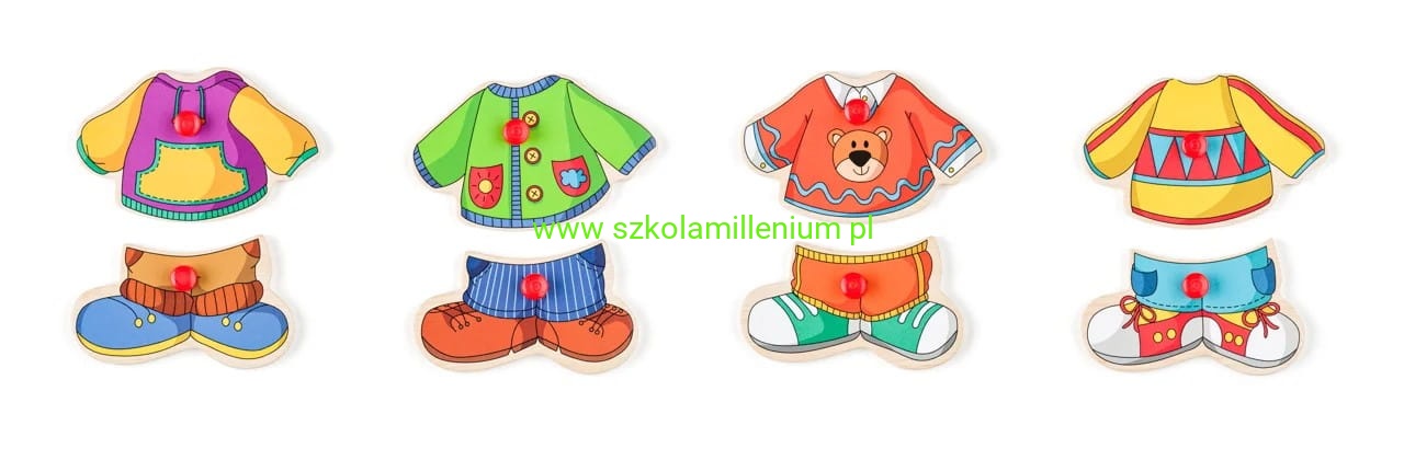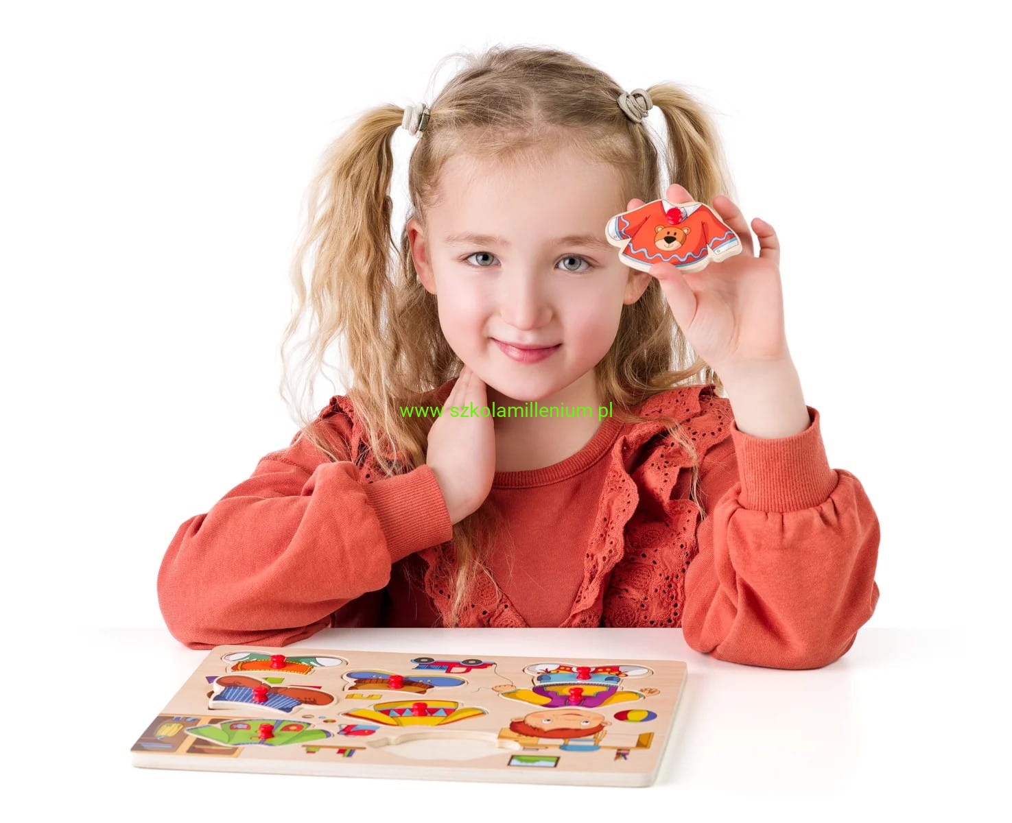 Układana drewniana, która rozwija w dziecku wyobraźnie i logiczne myślenie, a także małą motorykę. Puzzle na planszy, zadaniem dziecka jest ułożenie ośmiu elementów w odpowiednim miejscu, w zależności od koloru ubranek musi znaleźć odpowiednią parę i umieścić w odpowiednim otworze. Gra uczy zakładać i dopasowywać różne części garderoby.