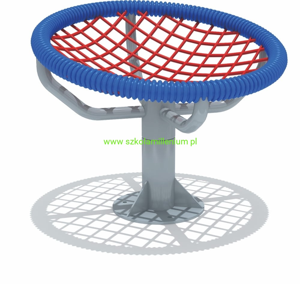 Obrotowe siedzisko bocianie gniazdo wykonane z tworzywa LLDPE, części metalowe galwanizowane i lakierowane proszkowo. Model zawiera okrągłe siedzisko z rozciągniętą siatką linową, która jest zamocowana na metalowej osi obrotu. Obrotowe siedzisko jest duże i wygodne, zaprojektowane tak, aby dziecko swobodnie mogło się kręcić.
