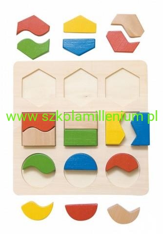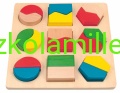 Układanka z podstawką na której znajduje się 9 otworów gdzie trzeba umieścić 18 klocków. Zadanie jednak nie będzie takie łatwe, gdyż elementy są podzielone na 3 kolumny i są różnych kształtów. Koła, kwadraty i sześciokąty, które są podzielone na dwie połówki czekają na ułożenie ich w odpowiednim miejscu na drewnianej płycie. Każdy podzielony element ma różne wcięcie: proste, falowe lub zygzakowte. Układanka rozwija u dzieci umiejętność obserwacji, logicznego myślenia oraz uczy rozpoznawać figury geometryczne.