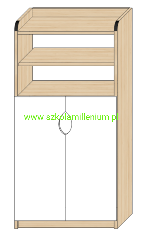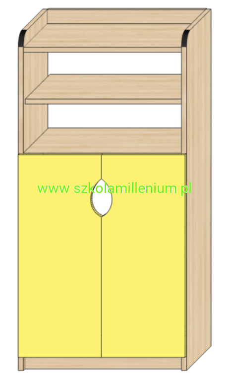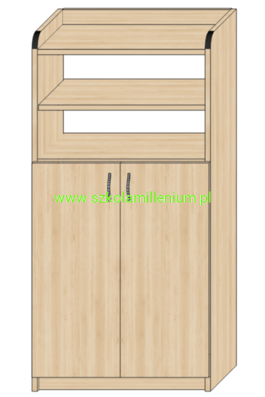 Szafka w dolnej części posiada dwa fronty zamykane z dwoma półkami w środku, powyżej dwie półki otwarte.