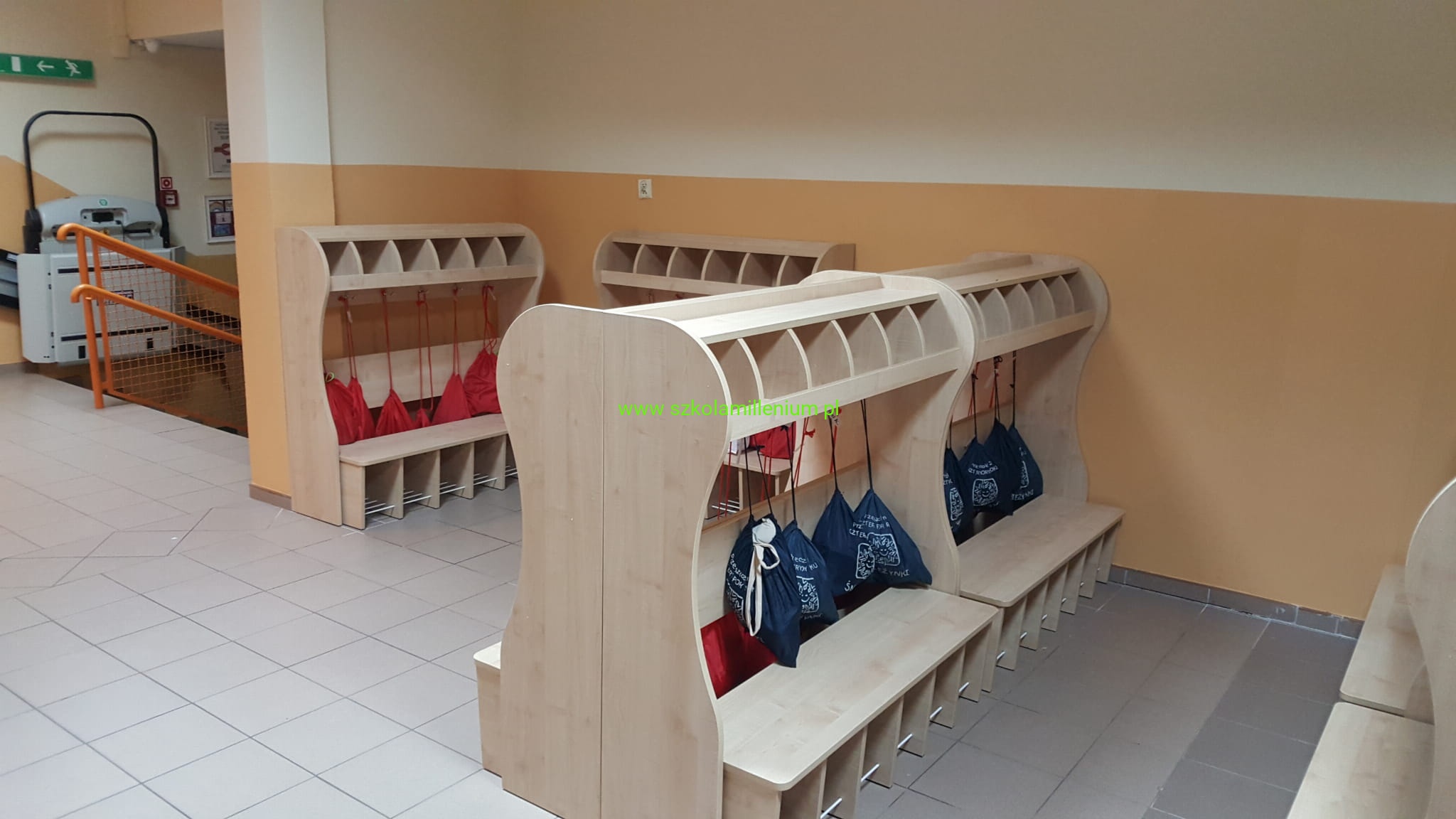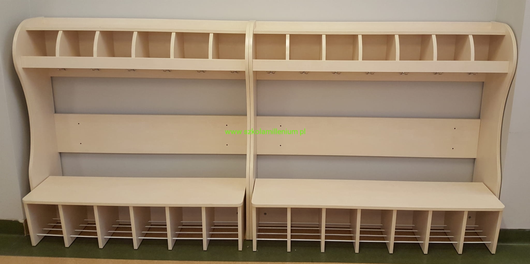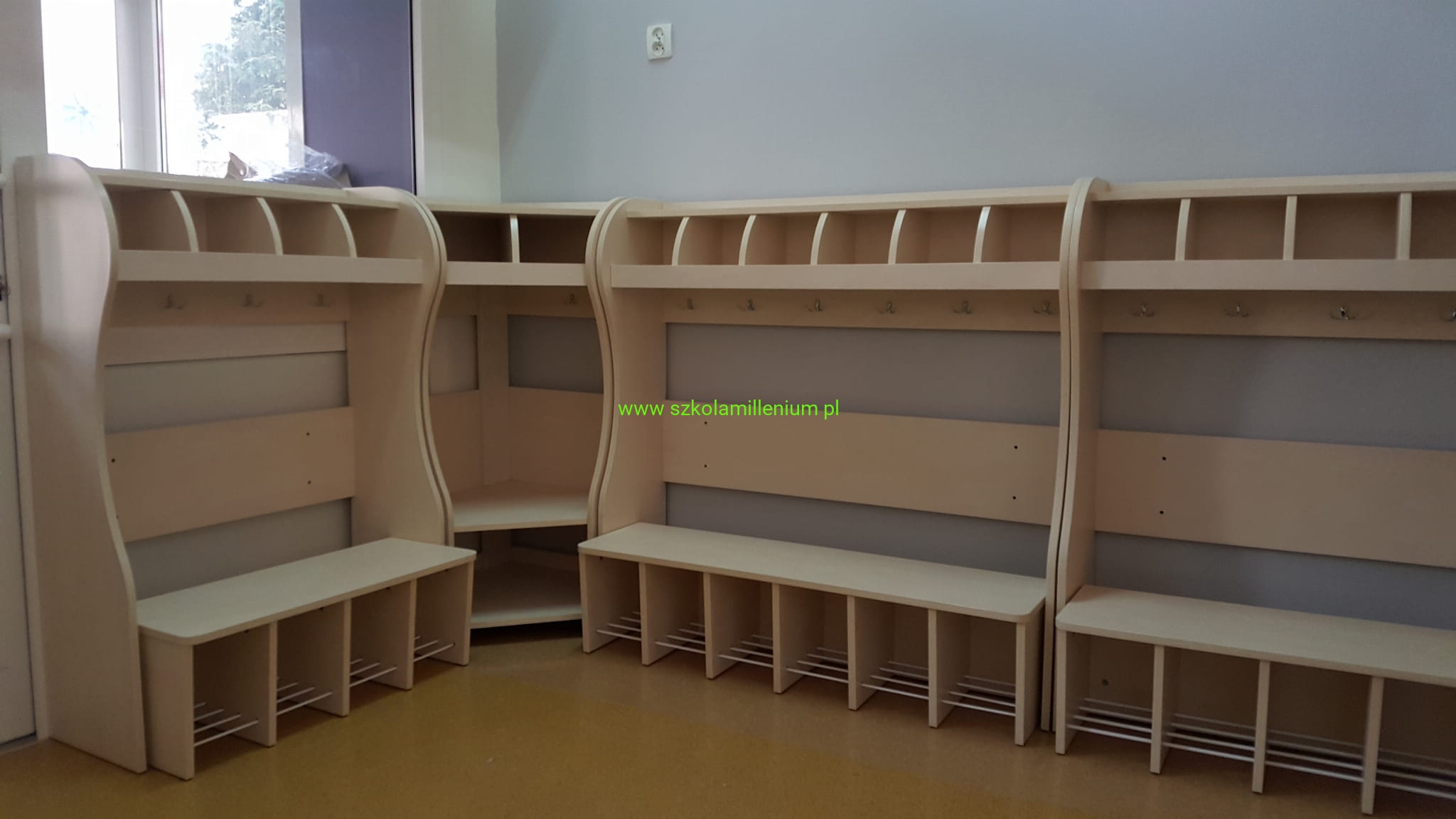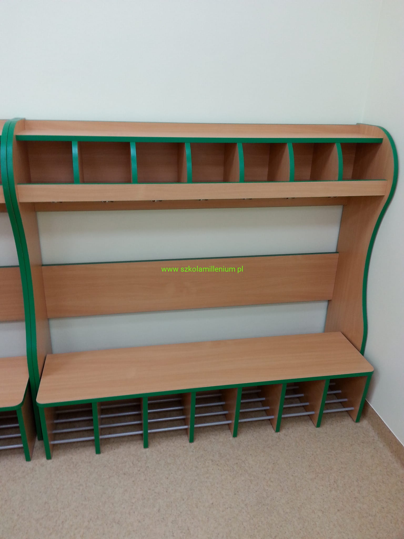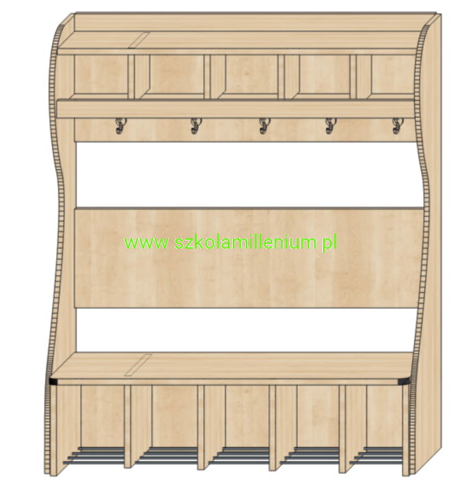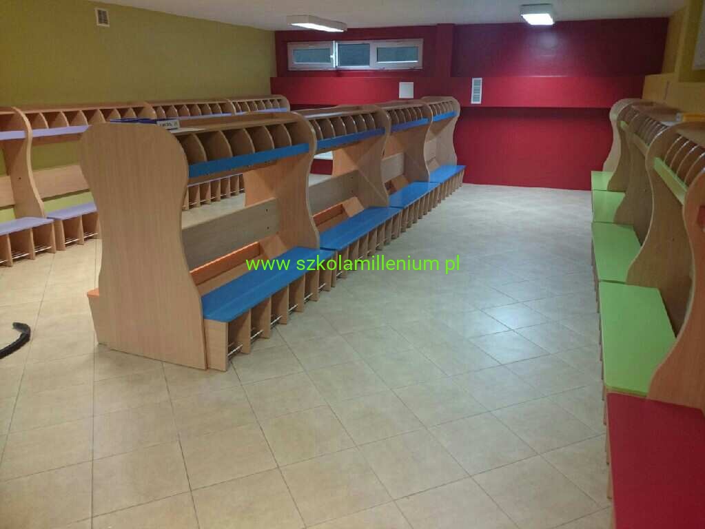 Szatnia w górnej części posiada półki na czapki oddzielnie dla każdego dziecka, poniżej podwójny wieszak, w dolnej części ławeczka z zaokrąglonym siedziskiem, wysuwana z miejscem na buty umieszczone na metalowych prętach, takie rozwiązanie ułatwia sprzątanie.