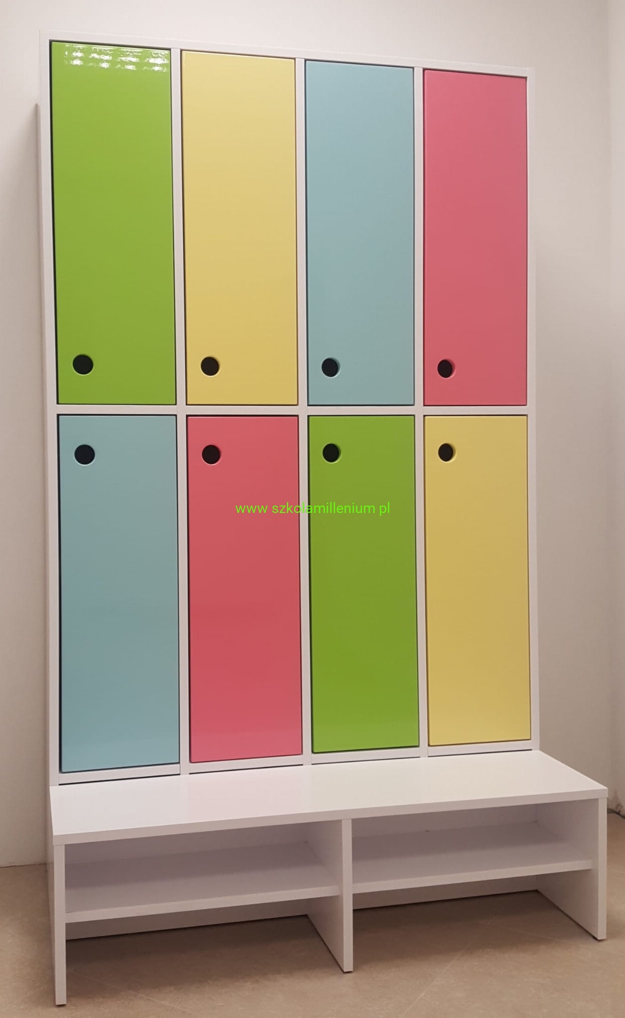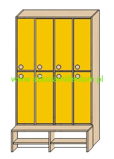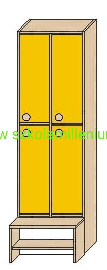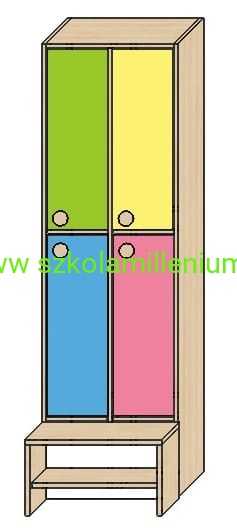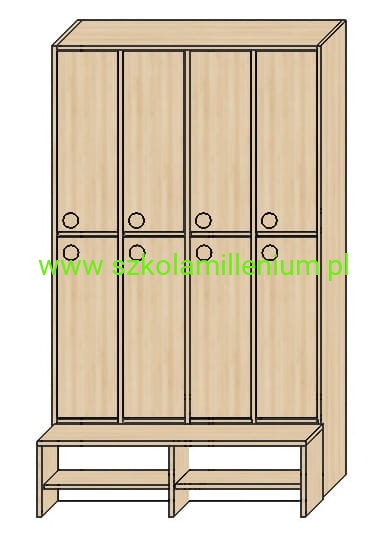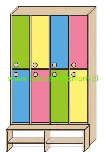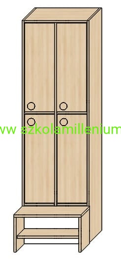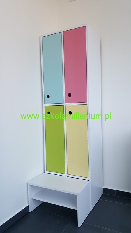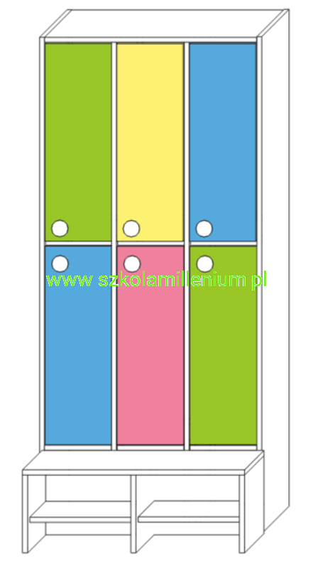 Szatnia w górnej i dolnej części posiada front zamykany z podwójnym wieszakiem, poniżej ławeczka ruchoma z miejscem na buty, takie rozwiązanie ułatwia sprzątanie.