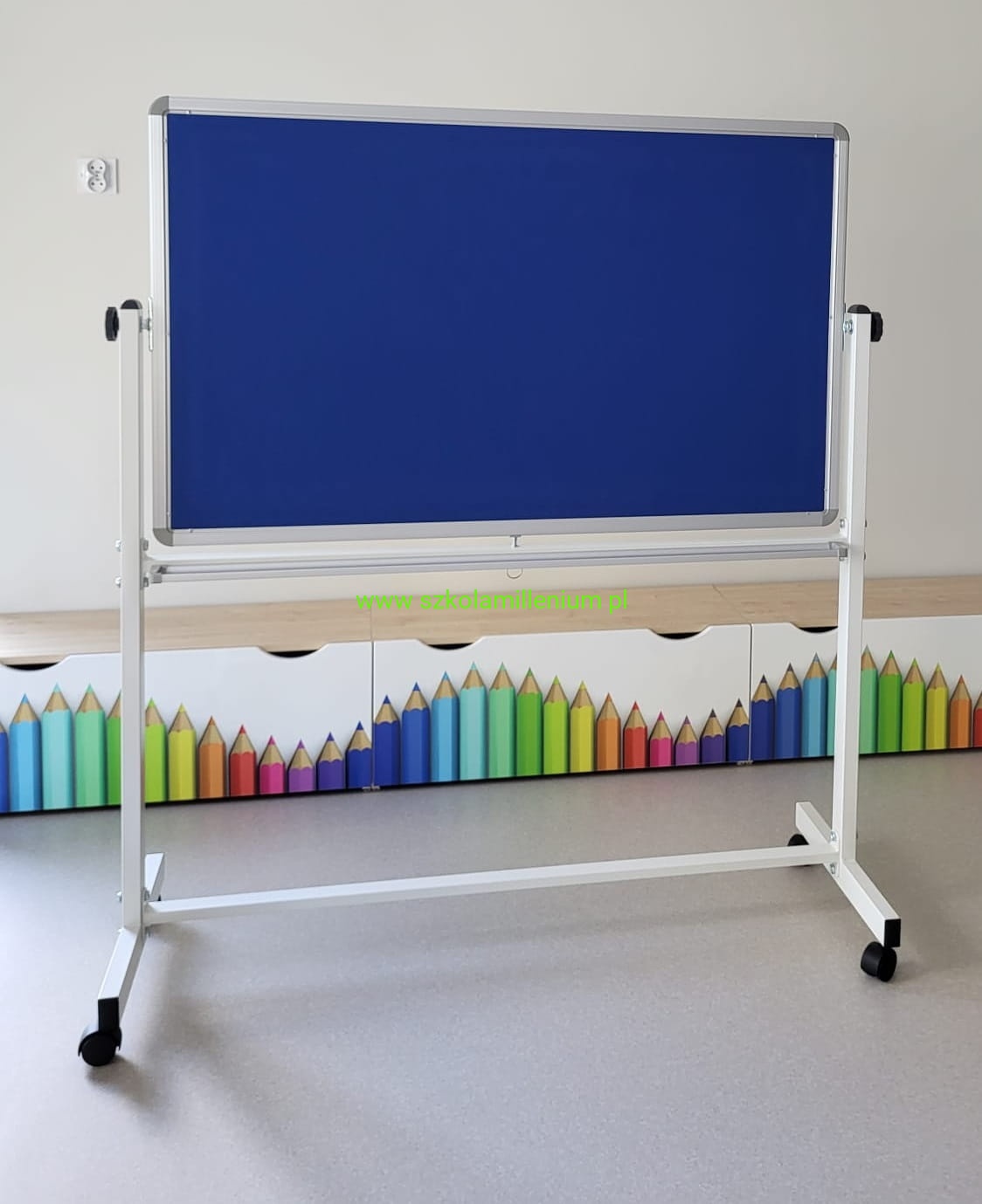 Tablica magnetyczna ze stojakiem, dwustronna. Tablica może być używana zarówno w klasach jak i na zewnątrz, jest swobodnie ruchoma o 360 stopni.