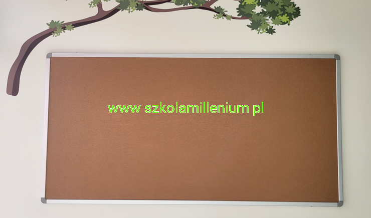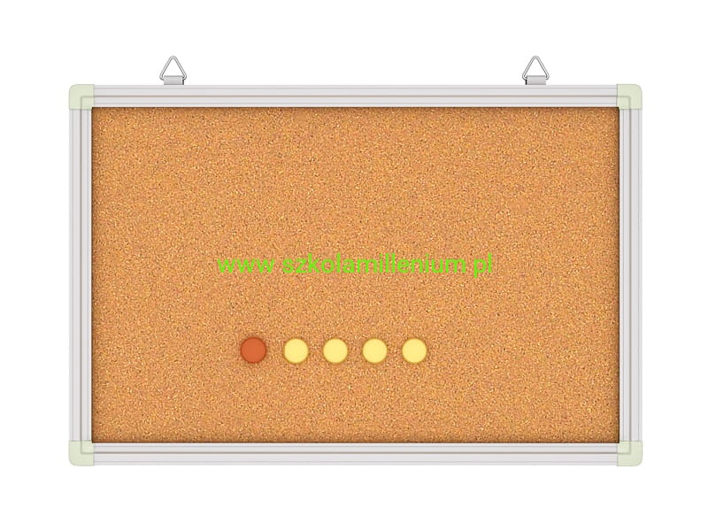 Tablica korkowa w ramie aluminiowej. Bezpieczne, zaokrąglone krawędzie, wykończone tworzywem ABS. Posiada zaczepy do mocowania.