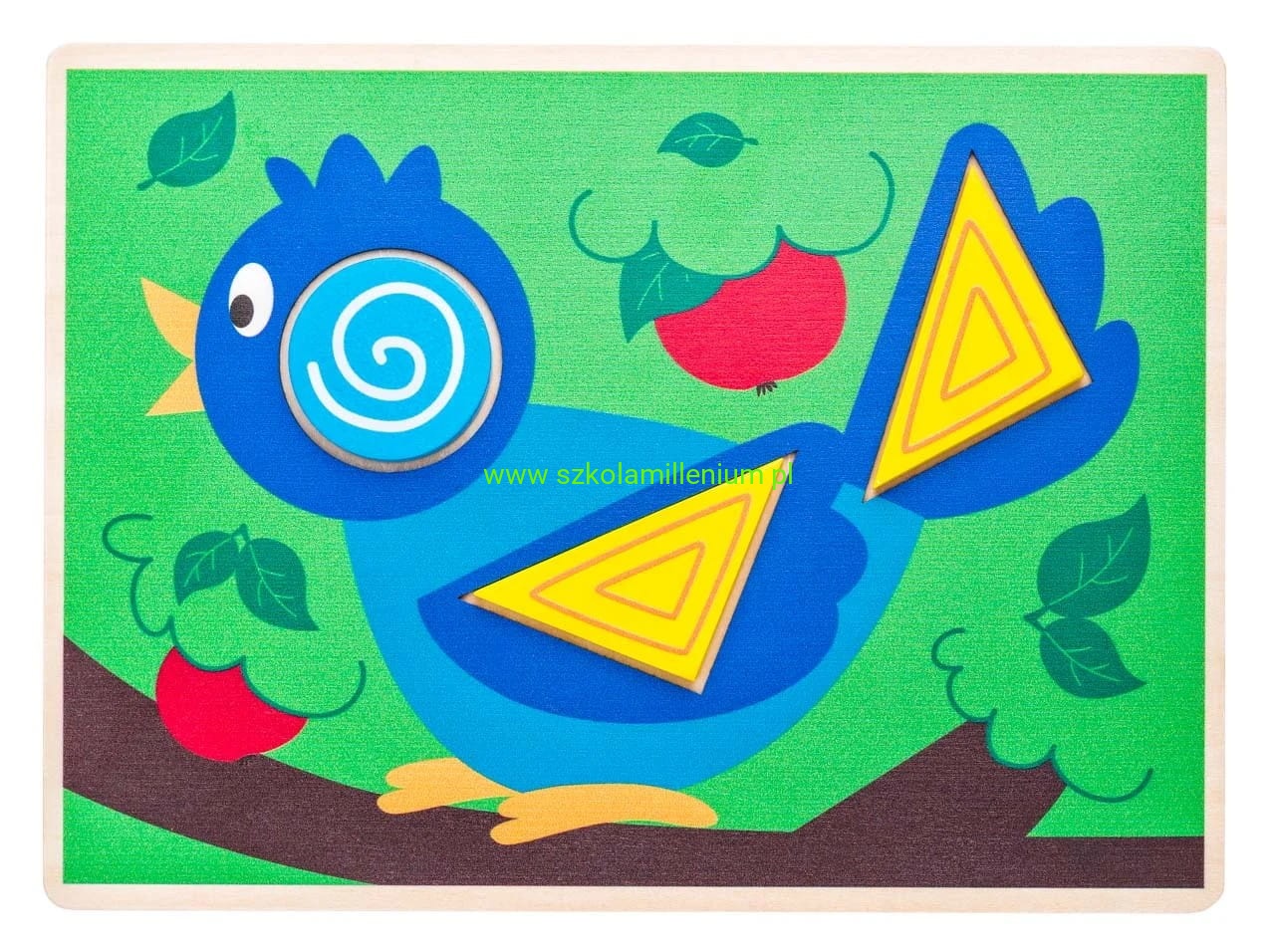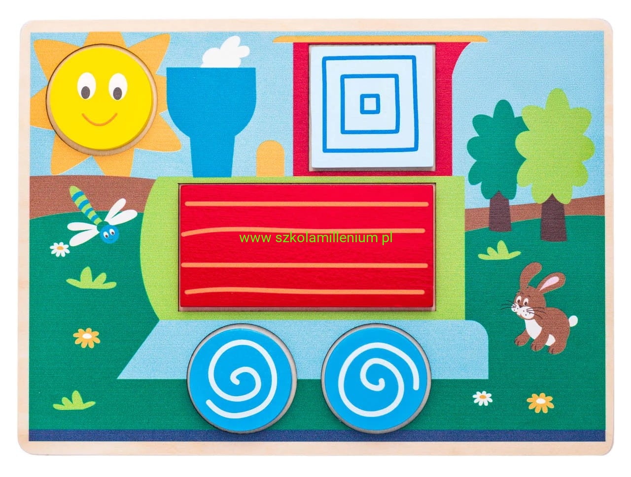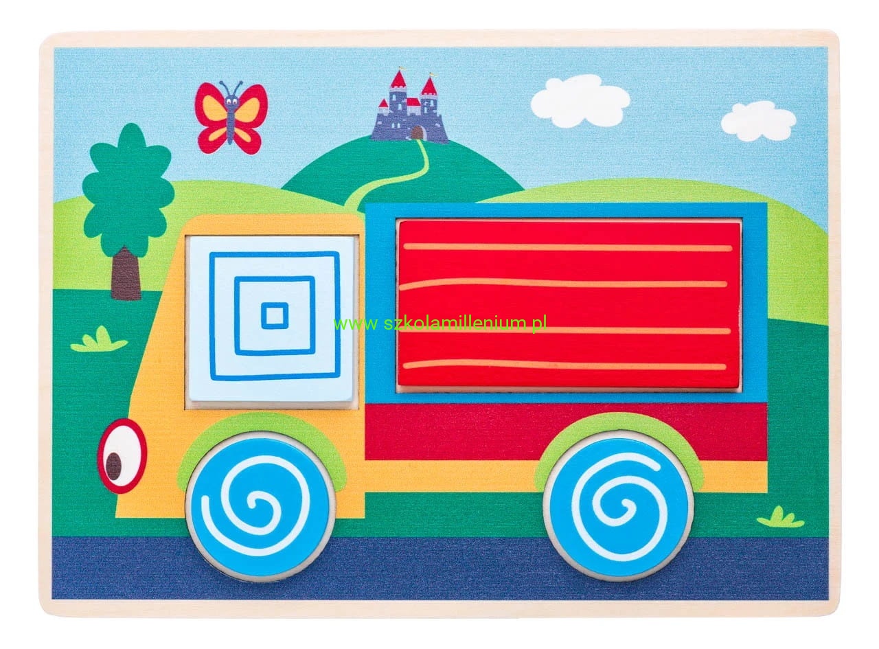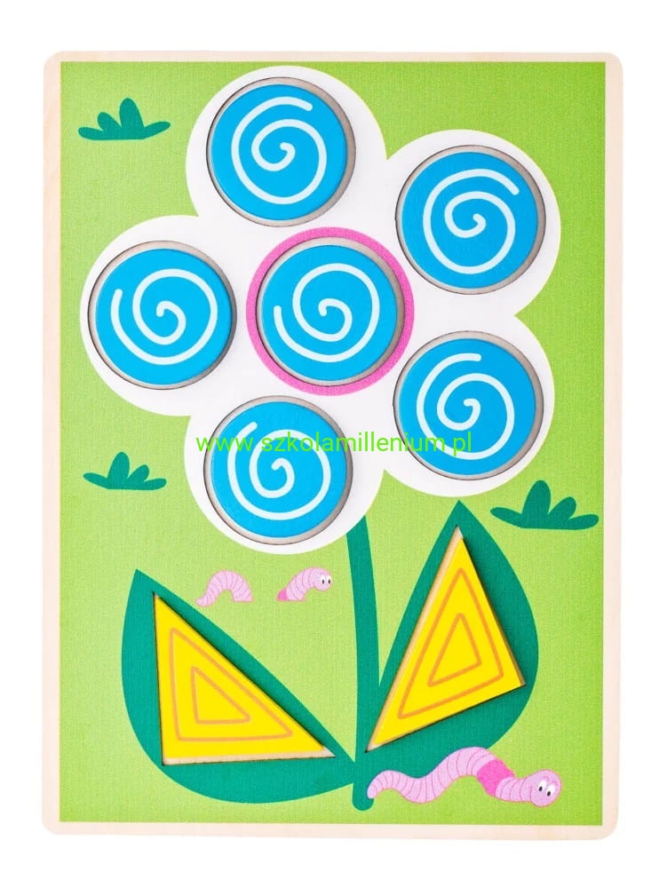 Drewniana kolorowa układanka, dzięki której dziecko tworzy piękne obrazki oraz uczy się sortować kształty. Dziecko ma za zadanie wybrać odpowiedni klocek i dopasować go do pasującego otworu na planszy tworząc kolorowy obrazek. Klocki można układać również poza planszami i bawić się na wiele sposobów.