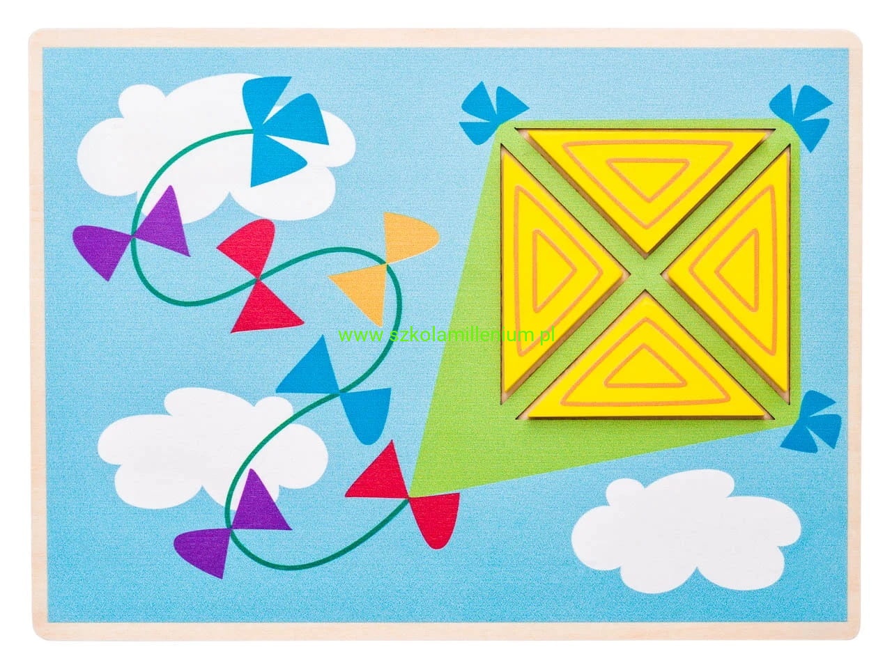 Zestaw zawiera: pięć dwustronnych plansz ze wzorami, czyli dziesięć obrazów do ułożenia, drewniane kolorowe klocki z nadrukami figur geometrycznych oraz pudełko z przegrodami do przechowywania.